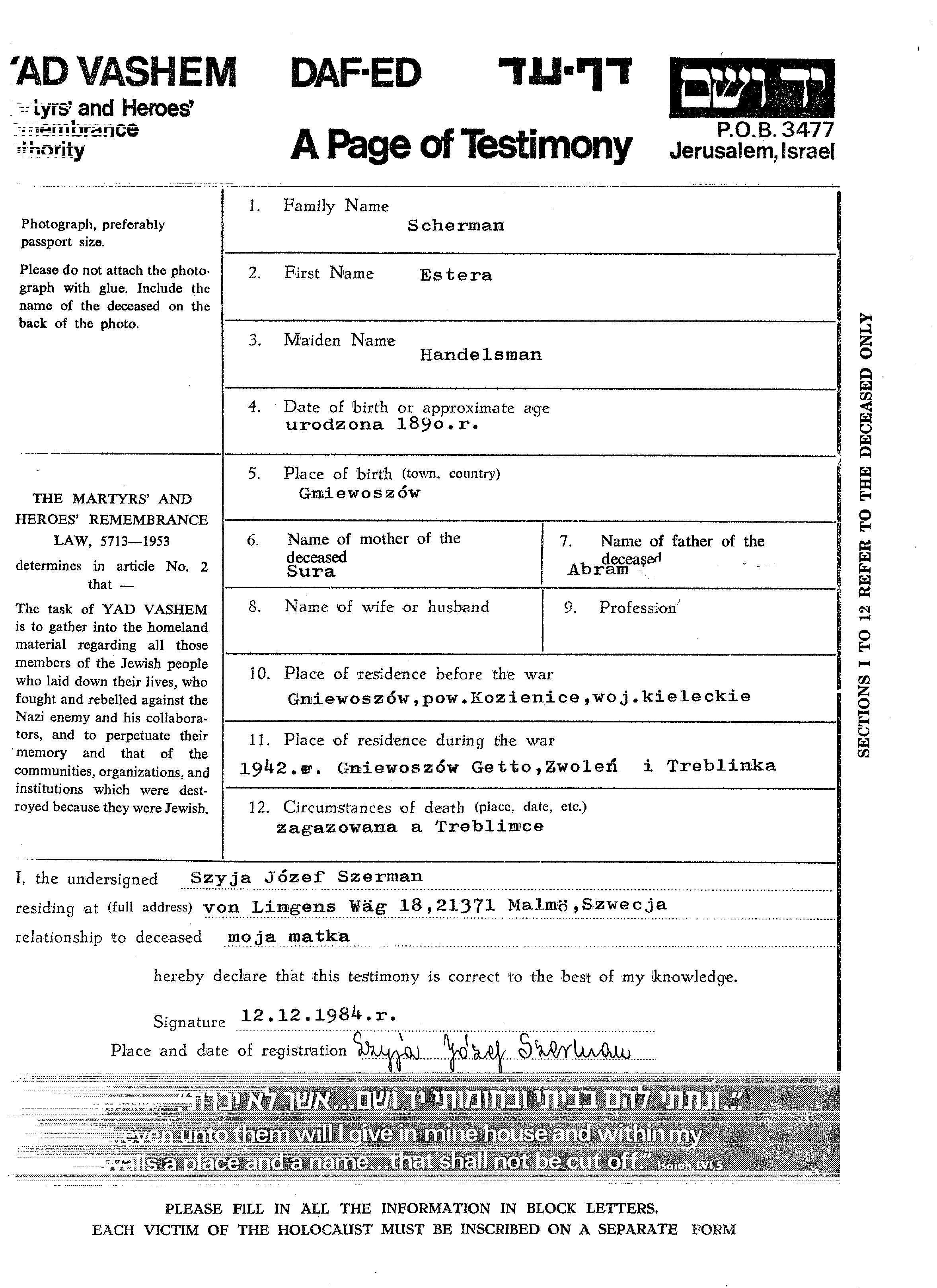 Estera Scherman née Handelsman est née à Gniewoszow, Pologne en 1890, fille de Abram et de Sura. Elle était Mariée. Avant la seconde guerre mondiale elle vivait à Gniewoszow, Pologne. Pendant la guerre, elle était à Gniewoszow, Pologne.