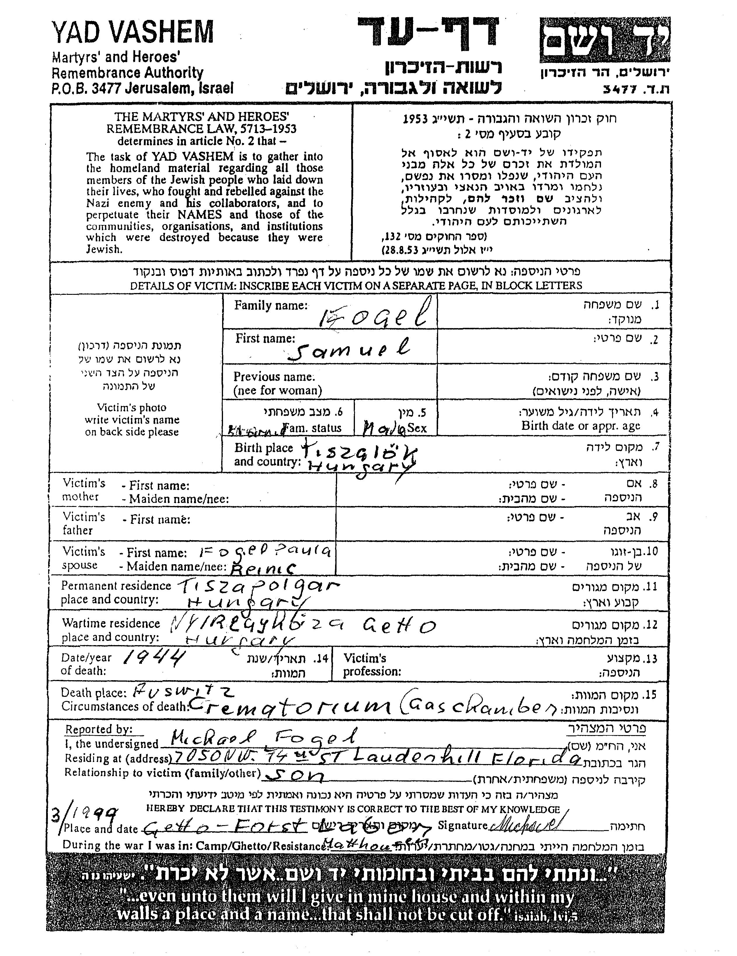Samuel Fogel est né à Tiszalok, Hongrie. Il était Mariée à Paula née Reinic. Avant la seconde guerre mondiale il vivait à Tiszapolgar, Hongrie. Au cours de la guerre, il était à Nyiregyhaza, Hongrie.