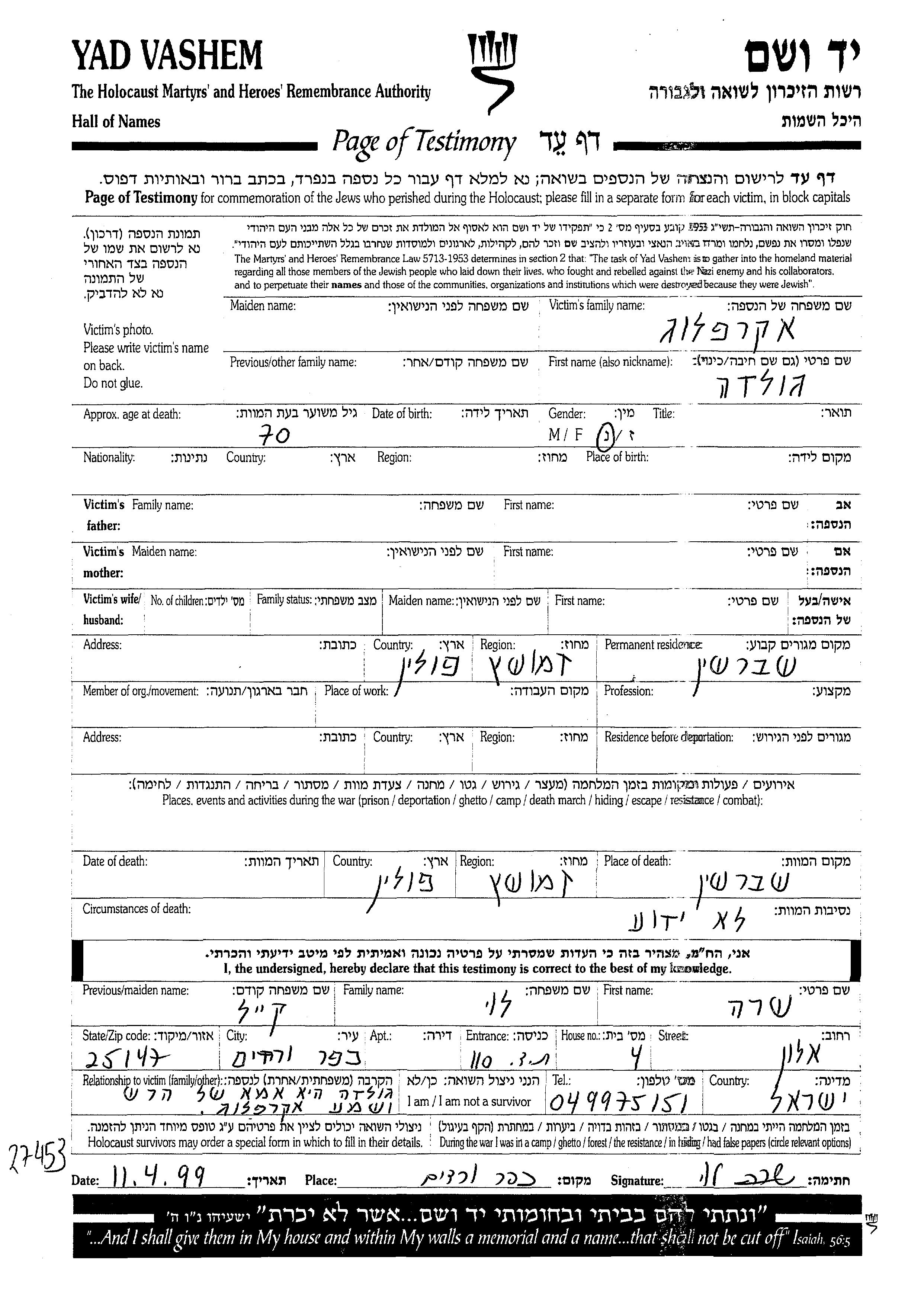 Yad Vashem - Pages of Testimony Names Memorial Collection