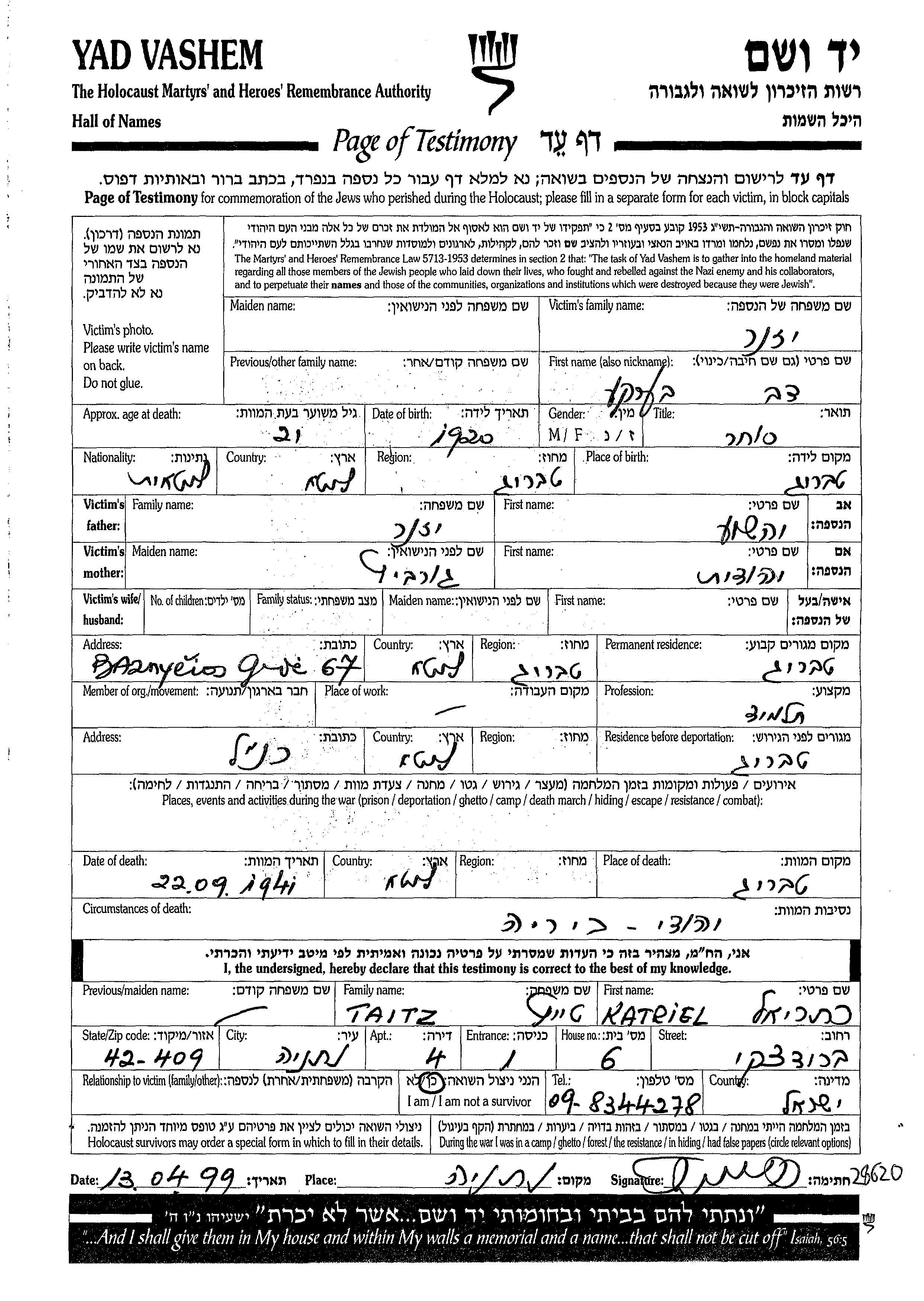 Yad Vashem - Pages of Testimony Names Memorial Collection