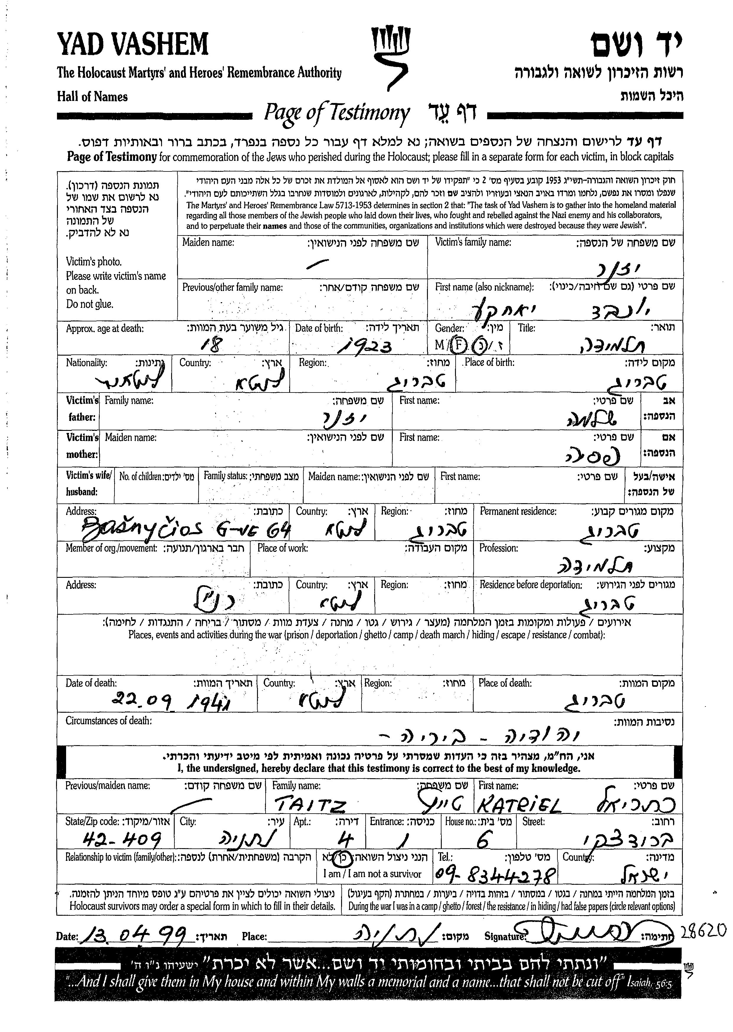 Yad Vashem - Pages of Testimony Names Memorial Collection