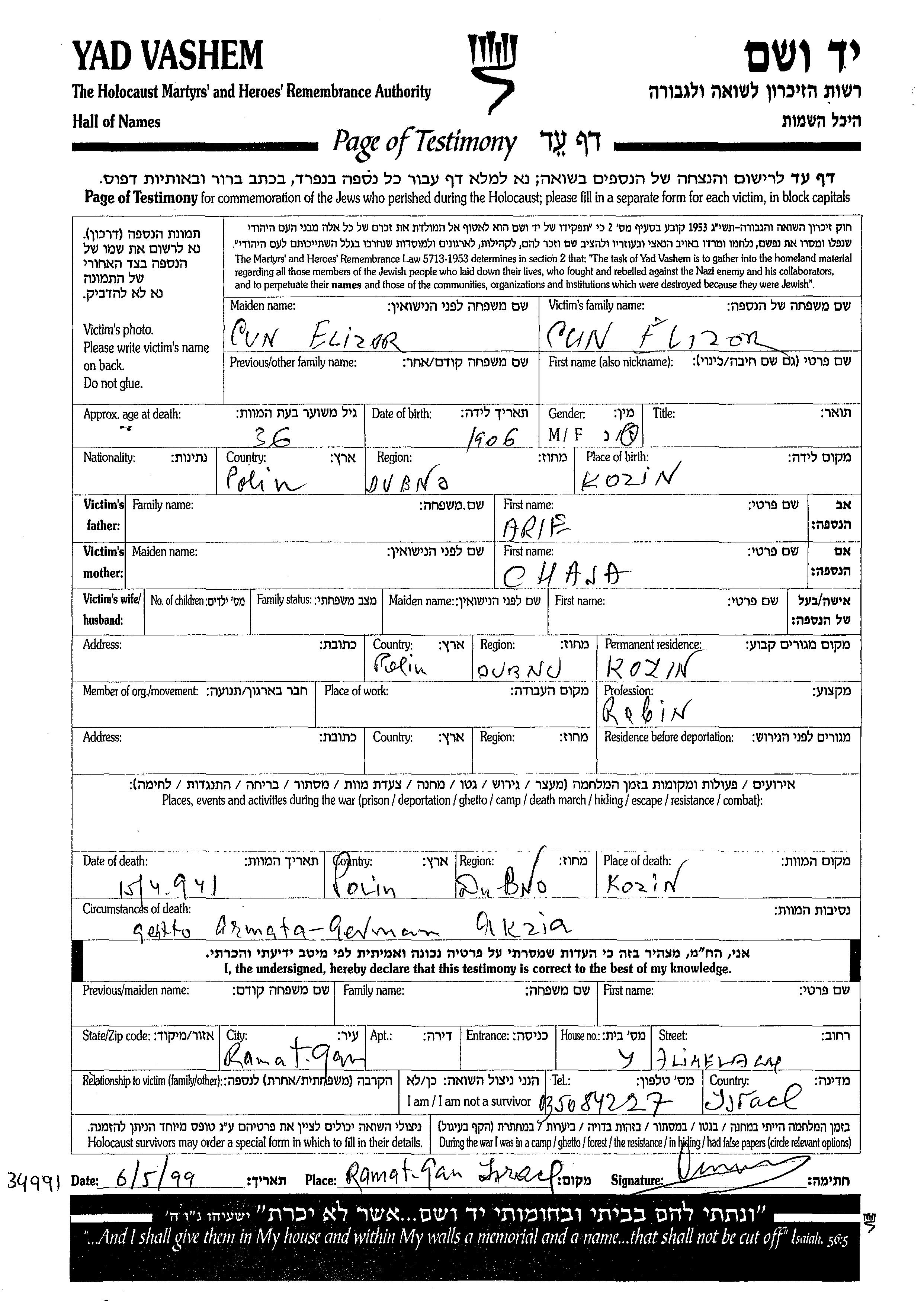Cun Elizer 1906 Kozin, Pologne Feuille de témoignage