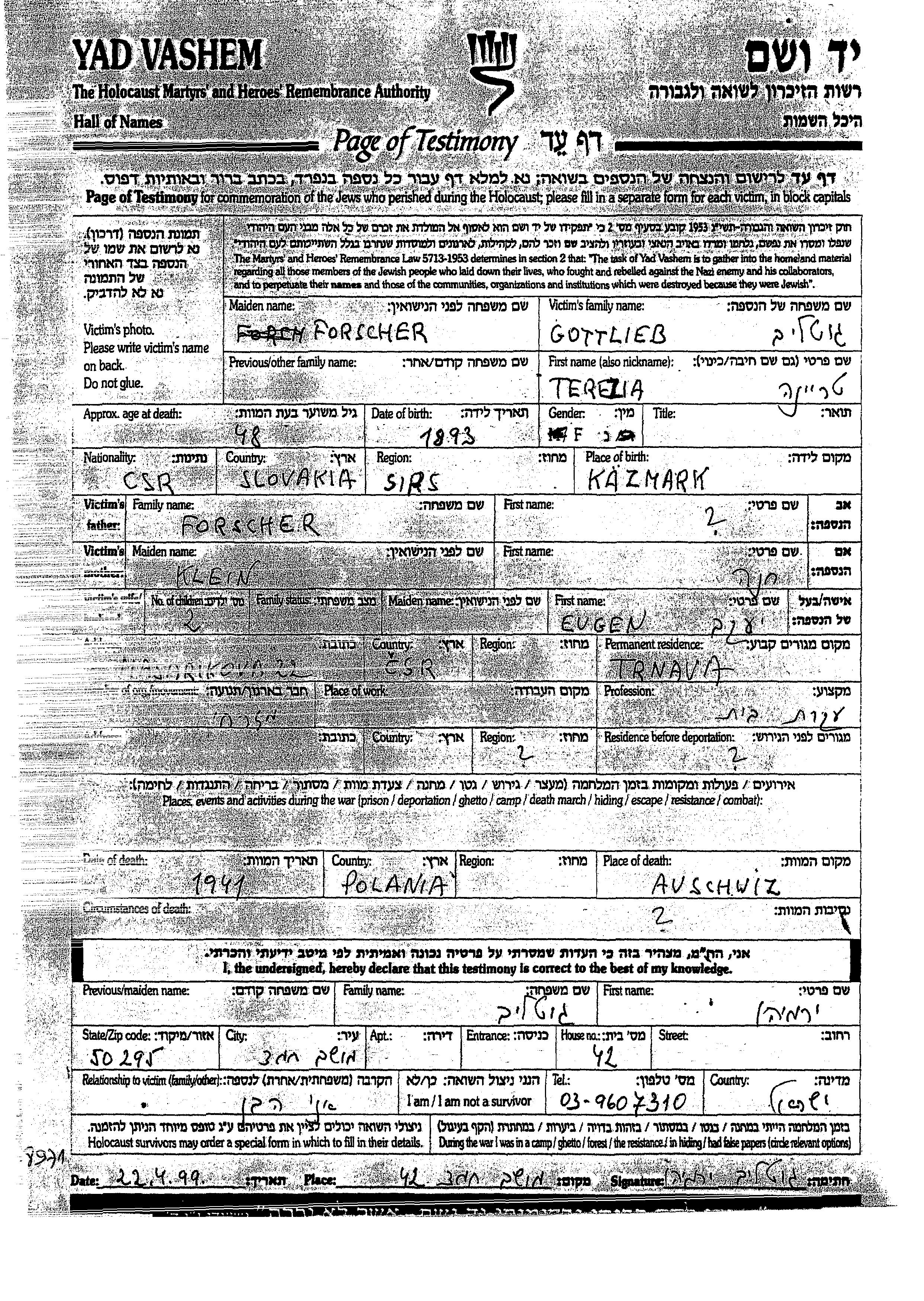Treina Terezia Gotlib née Forscher est née à Kezmark, Tchécoslovaquie en 1893, fille de Khana née Klein. Elle était Femme au foyer et Mariée à Yaakov Eugen. Avant la seconde guerre mondiale elle vivait à Trnava, Tchécoslovaquie.