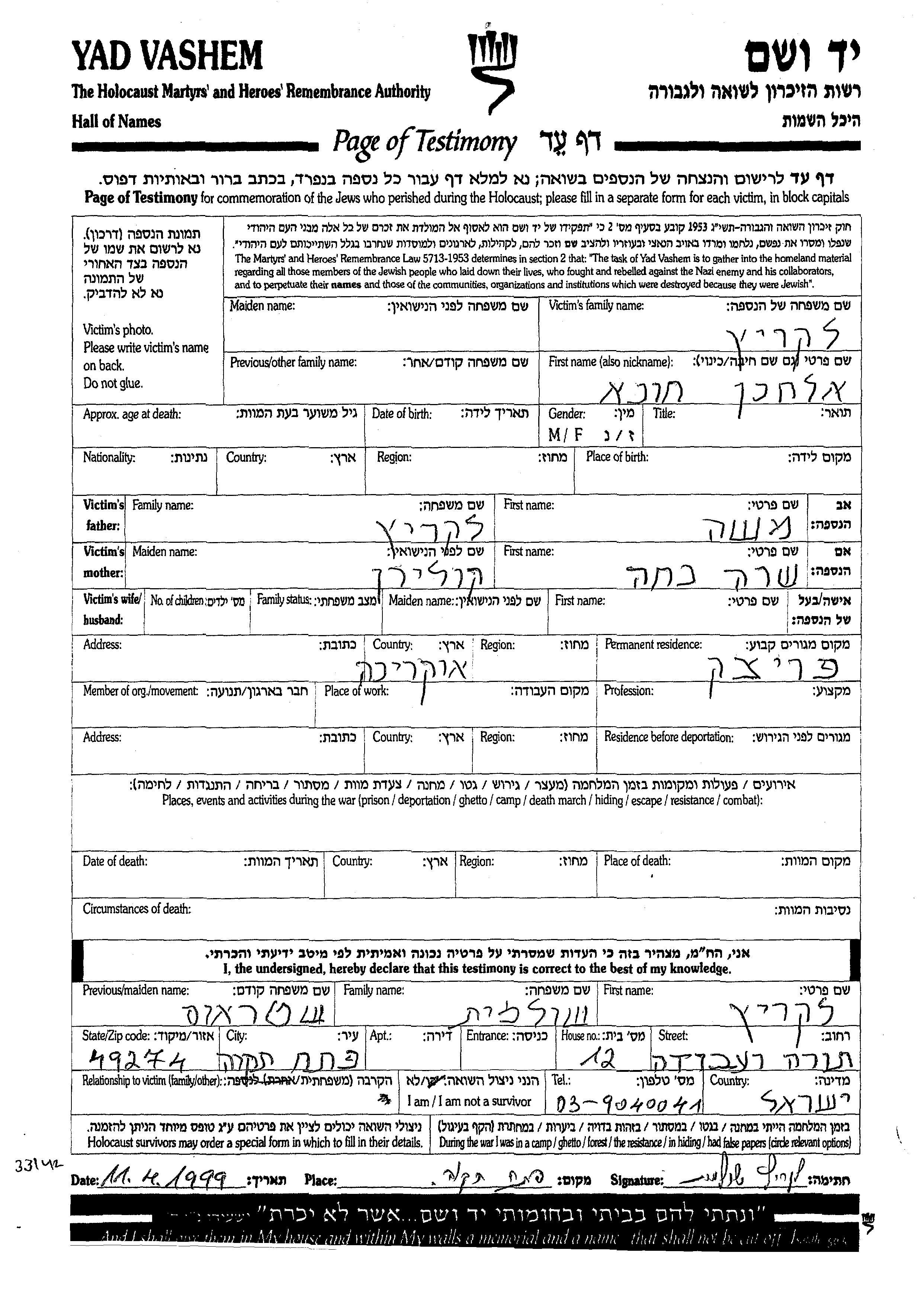 Yad Vashem - Pages of Testimony Names Memorial Collection