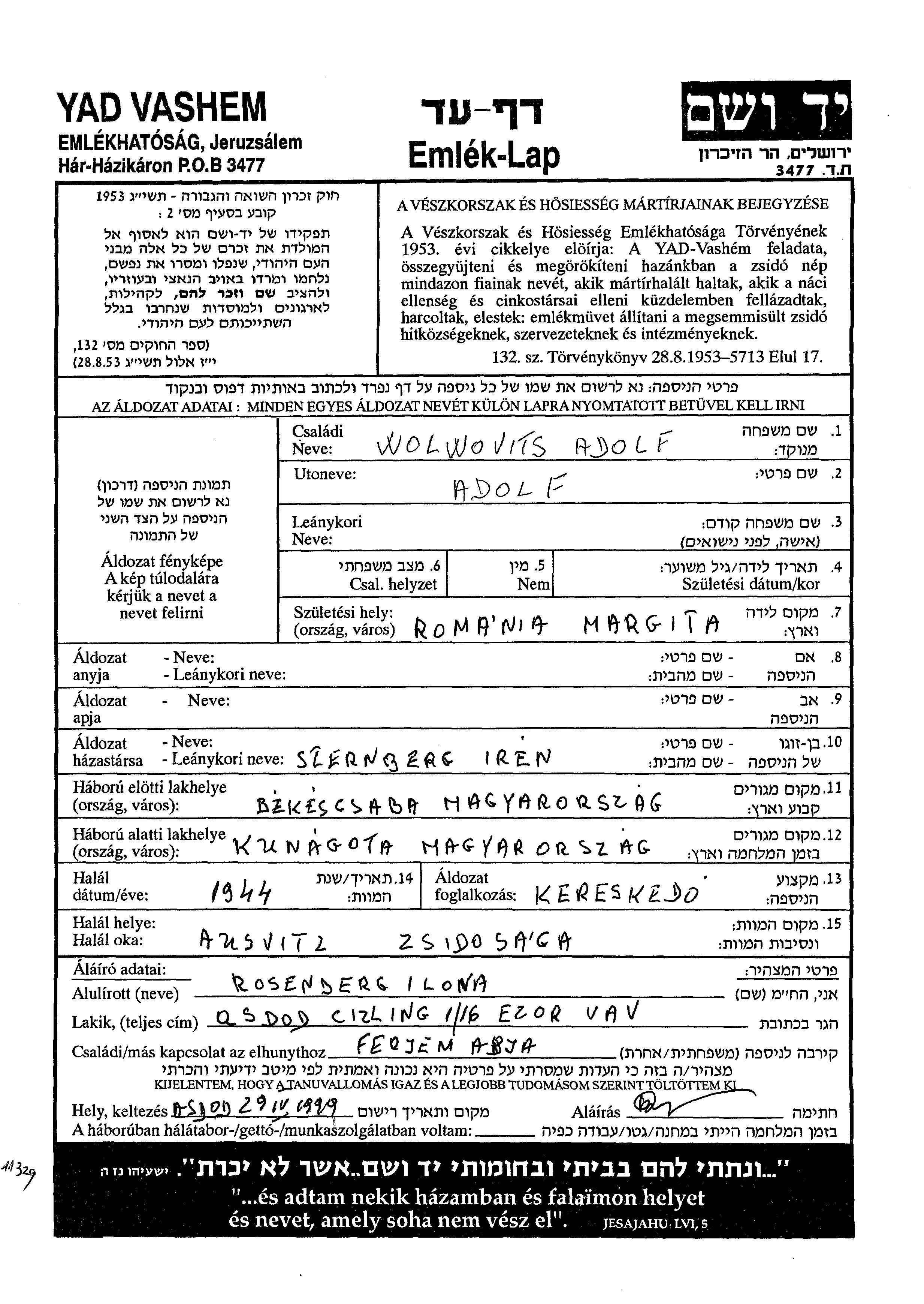 Wolwovits Adolf Bekeschewa, Hongrie Feuille de témoignage