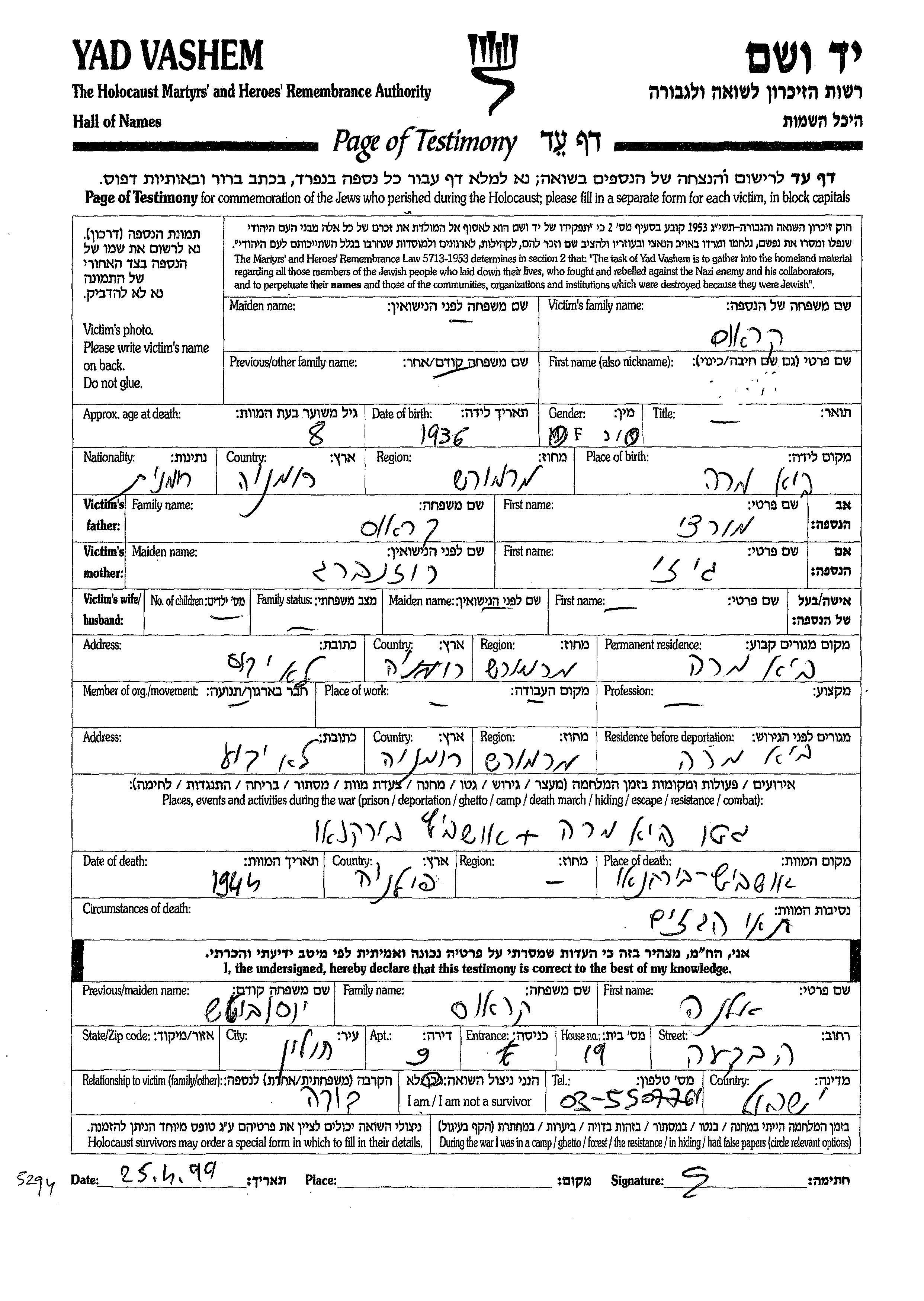 Yad Vashem - Pages of Testimony Names Memorial Collection