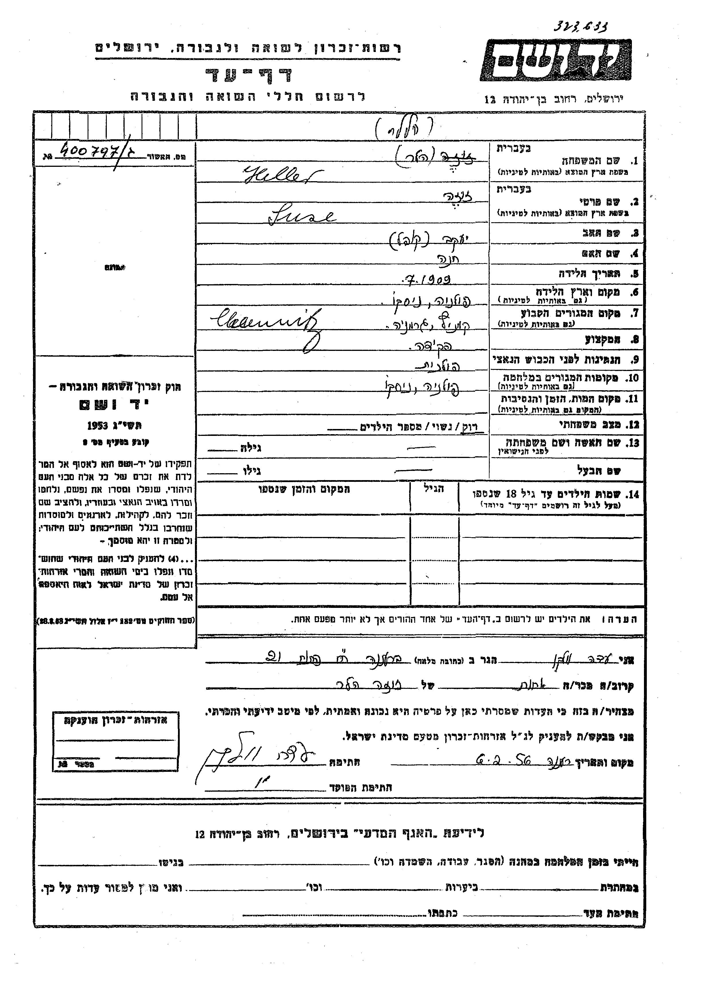 Yad Vashem - Pages of Testimony Names Memorial Collection