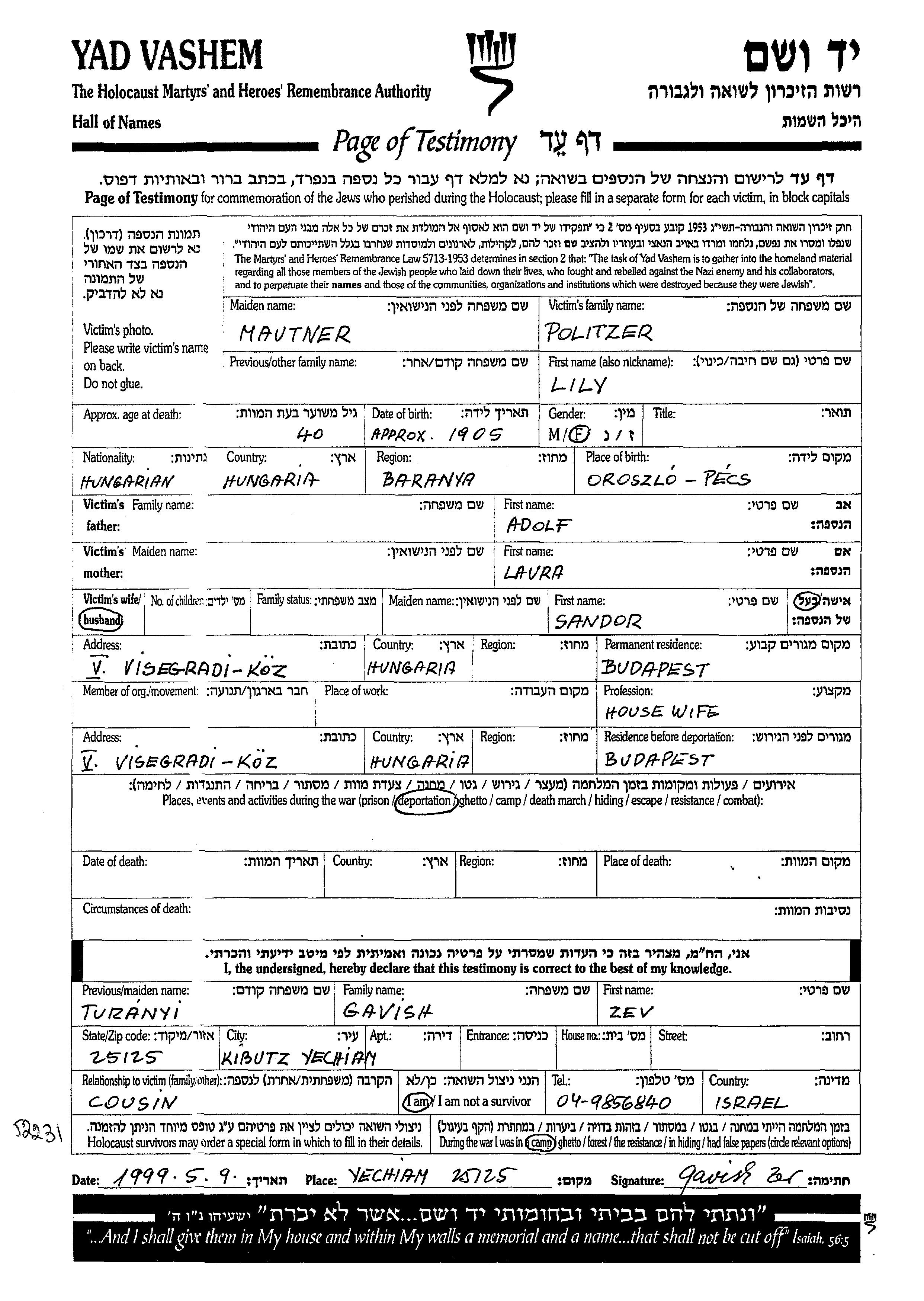 Lily Politzer née Mautner est née à Pecs, Hongrie en 1905, fille de Adolf et de Laura. Elle était Femme au foyer et Mariée à Sandor. Avant la seconde guerre mondiale elle vivait à Budapest, Hongrie. Pendant la guerre, elle était à Budapest, Hongrie.