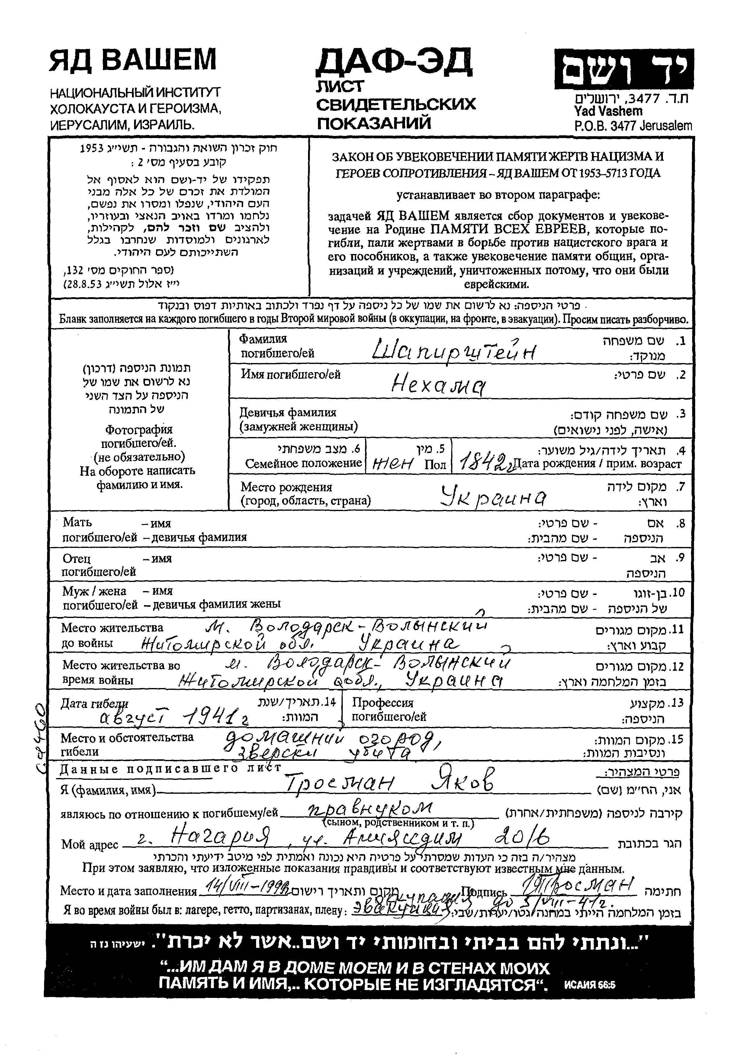 Shapirshtein Nekhama 1842 Volodarsk Volynskiy, Ukraine (URSS) Feuille de témoignage