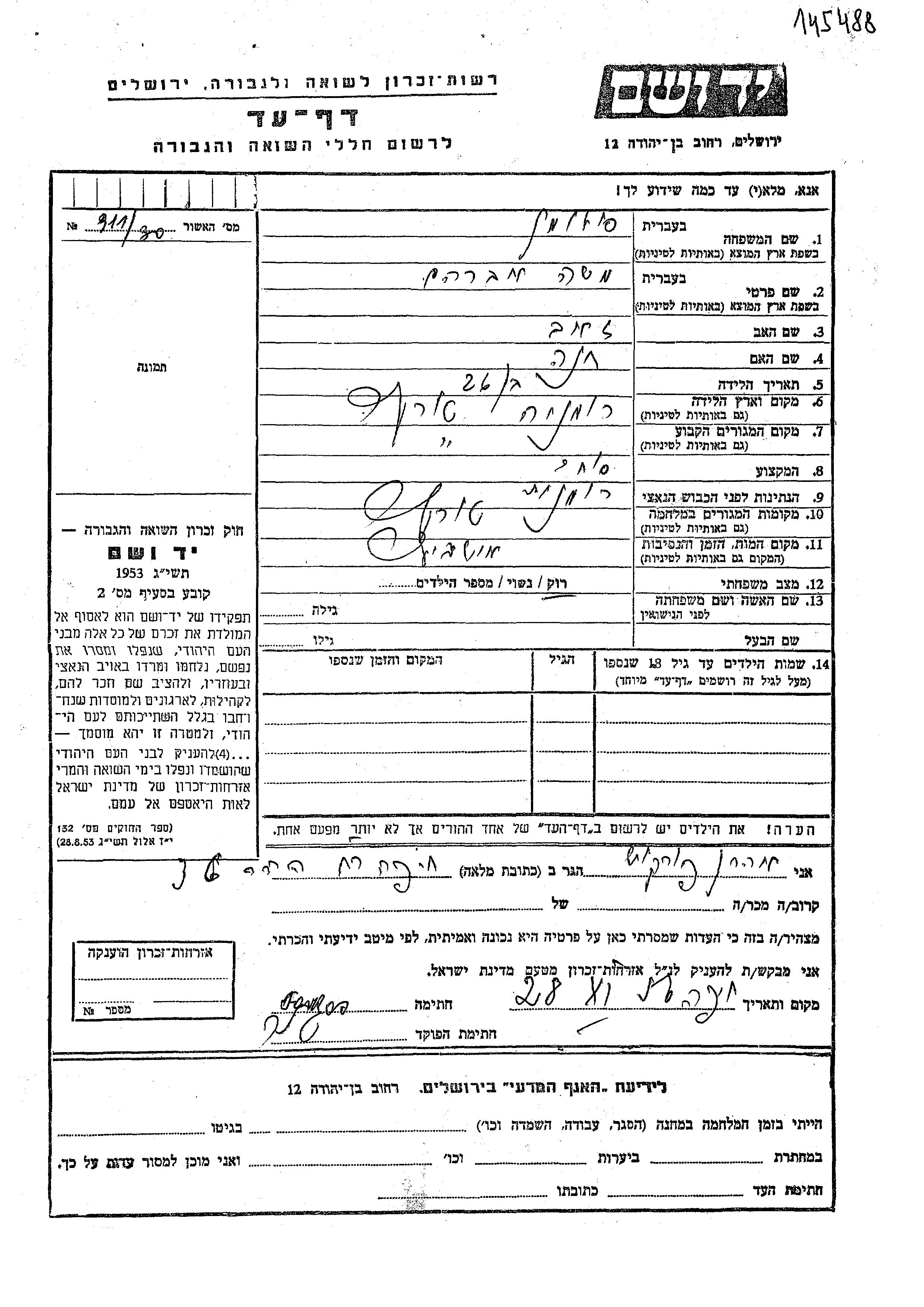 Yad Vashem - Pages of Testimony Names Memorial Collection
