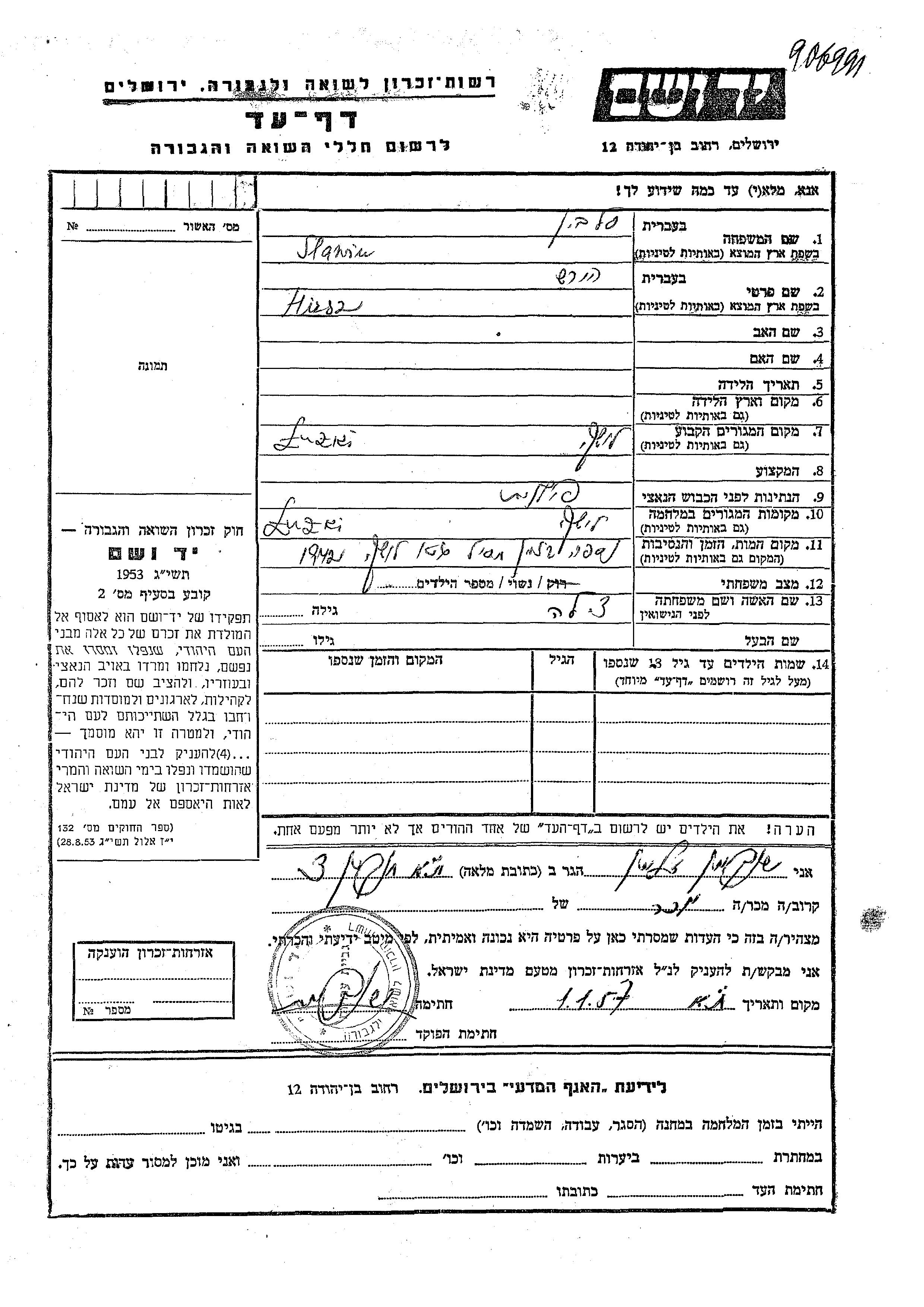Yad Vashem - Pages of Testimony Names Memorial Collection