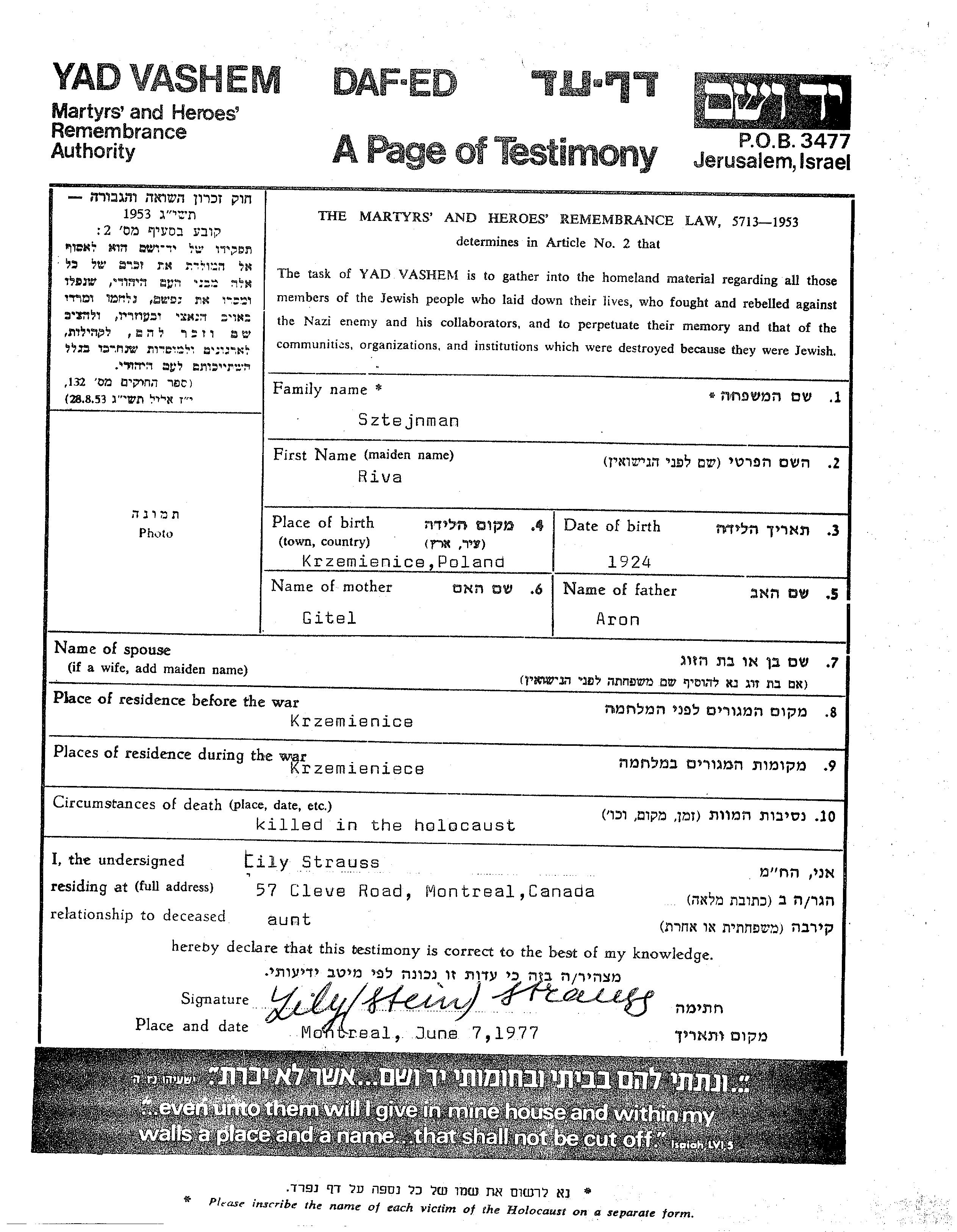 Riva Sztejnman est née à Krzemieniec, Pologne en 1924, fille de Aron et de Gitel. Elle était Célibataire. Avant la seconde guerre mondiale elle vivait à Krzemieniec, Pologne. Pendant la guerre, elle était à Krzemieniec, Pologne.