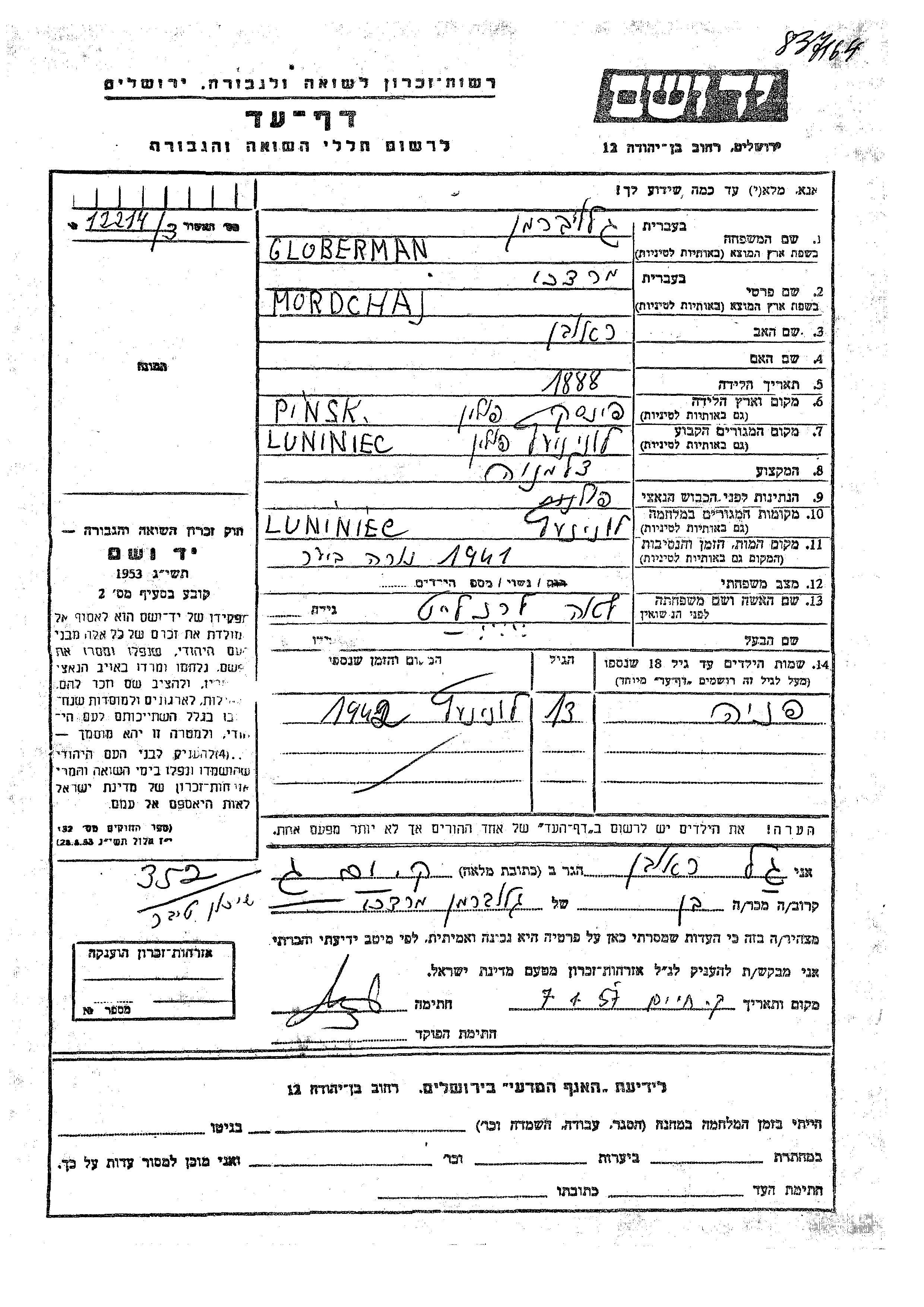Globerman Mordechaj 1888 Luniniec, Pologne Feuille de témoignage