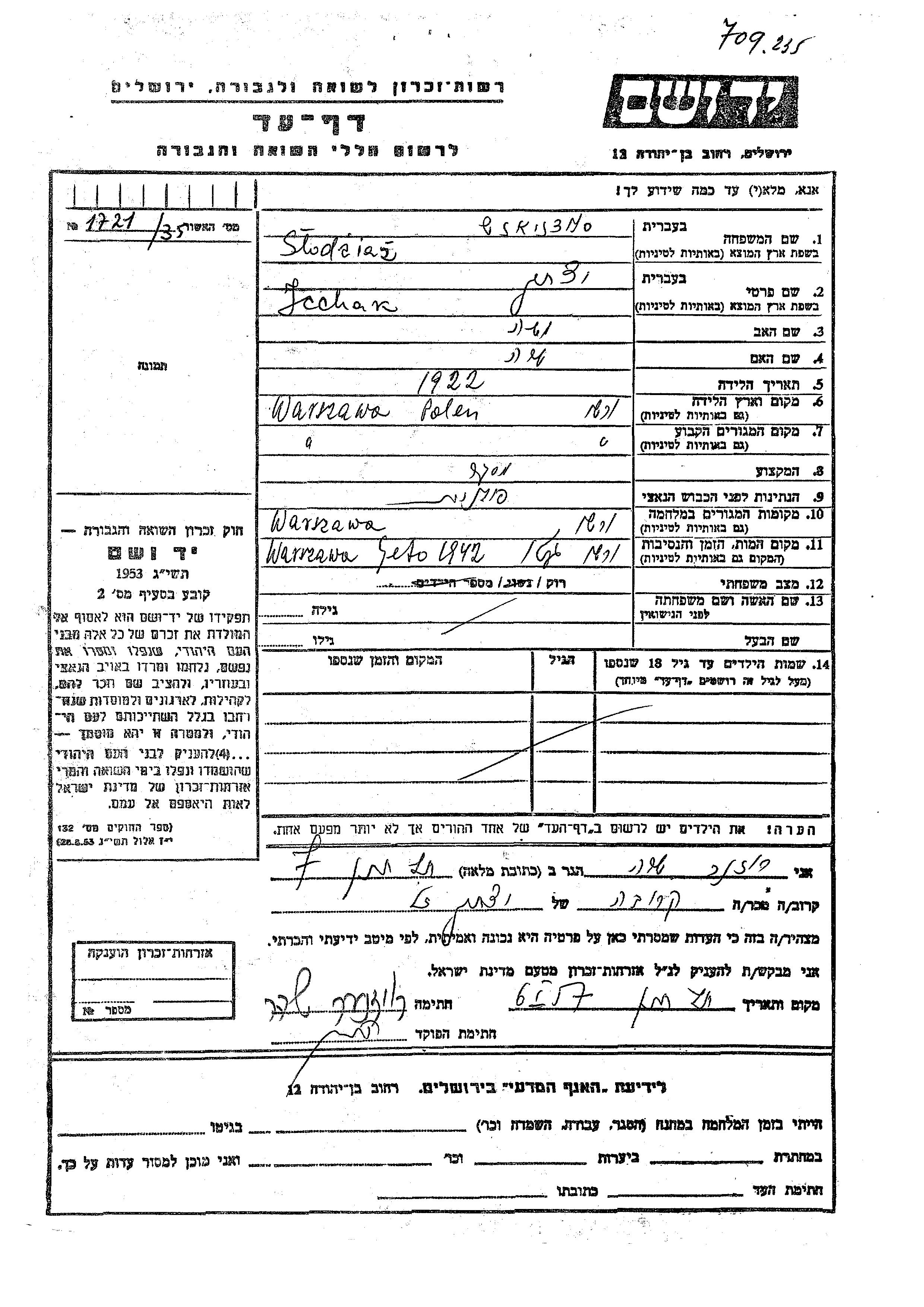 Slodash Ischak 1922 Warszawa, Pologne Feuille de témoignage
