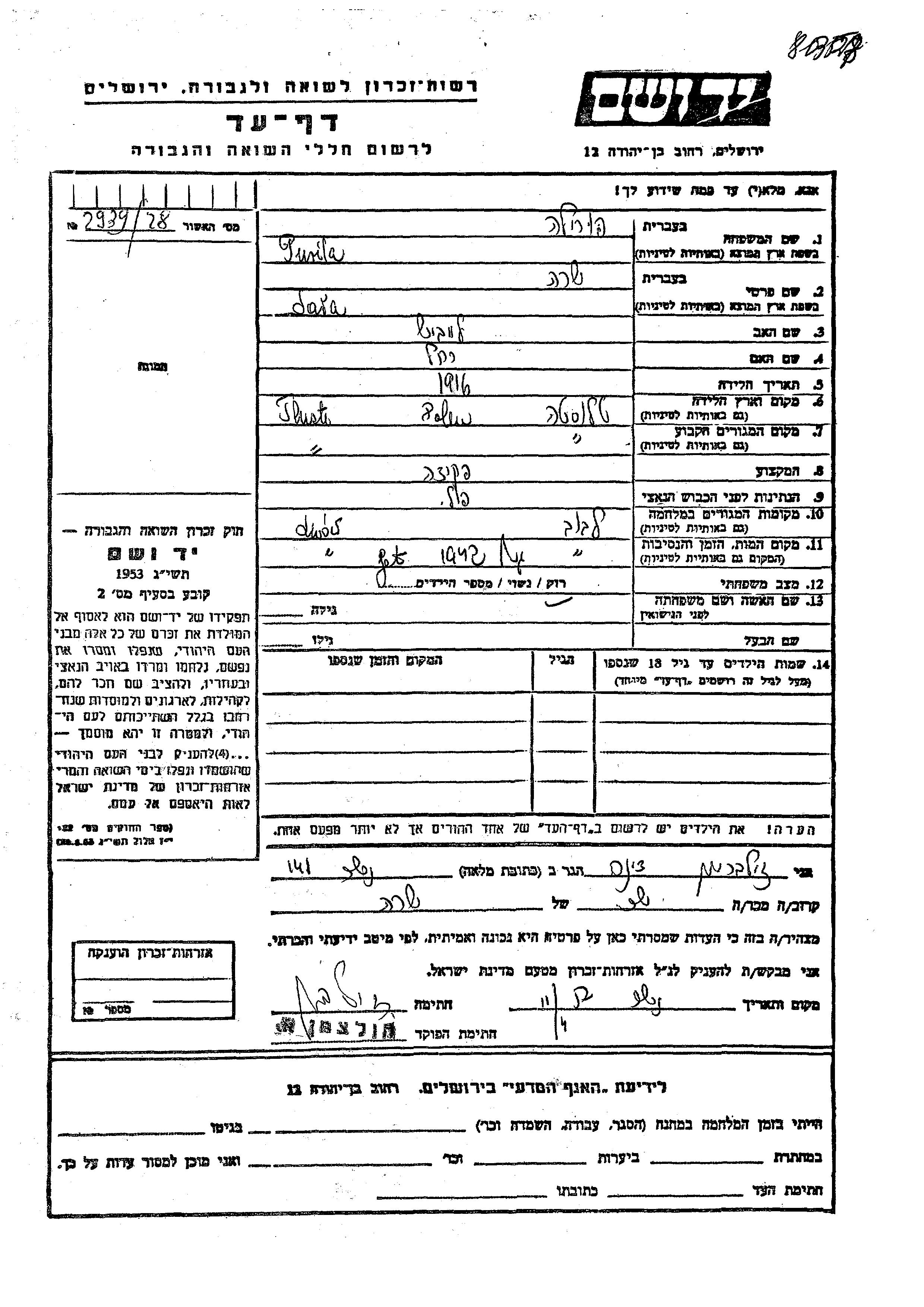 Yad Vashem - Pages of Testimony Names Memorial Collection