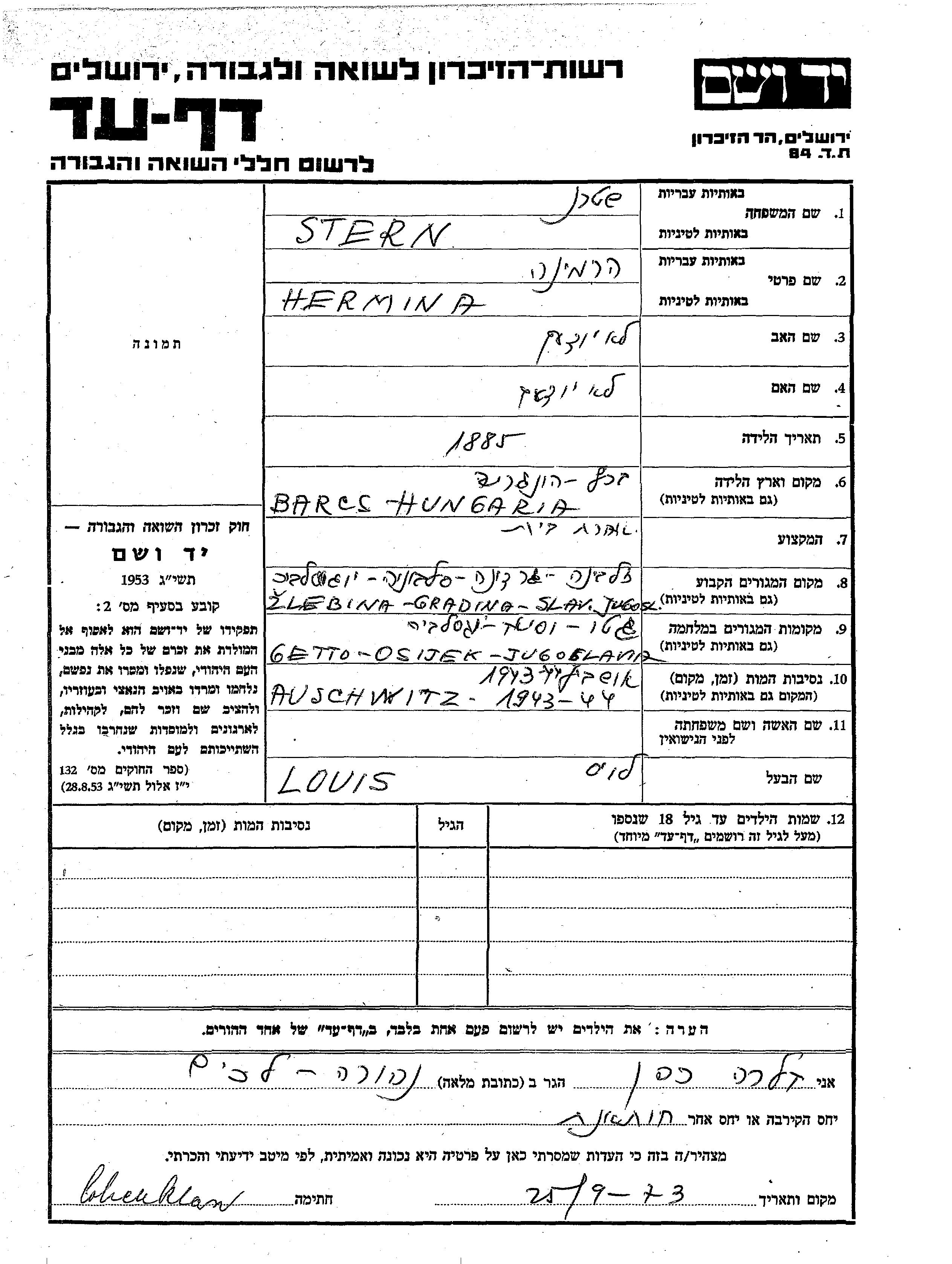 Hermina Stern est née à Barcs, Hongrie en 1885. Elle était Femme au foyer. Avant la seconde guerre mondiale elle vivait à Zlebina, Yugoslavie. Pendant la guerre, elle était à Osijek, Yugoslavie.