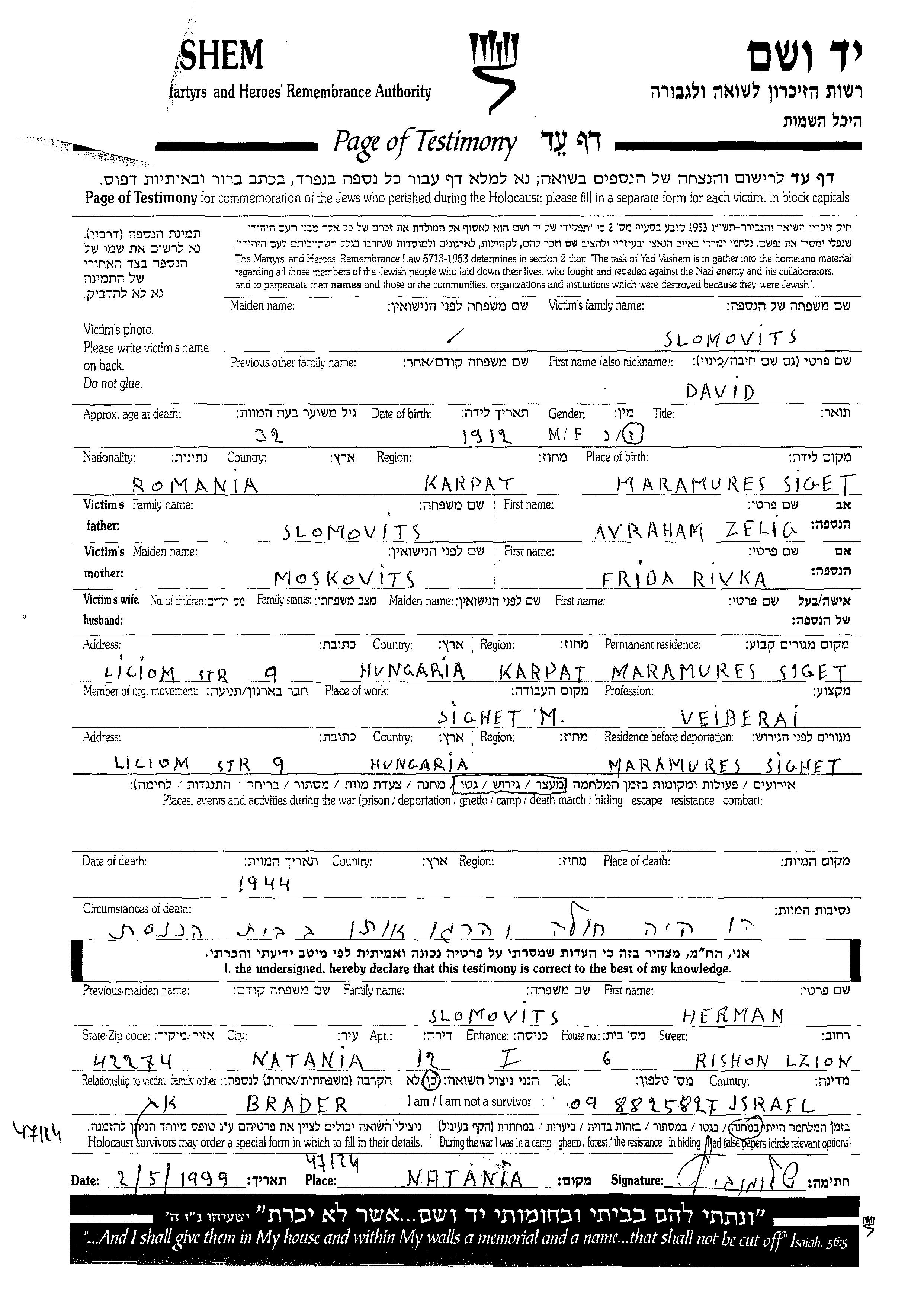Slomovits David 1912 Siget, Roumanie Feuille de témoignage