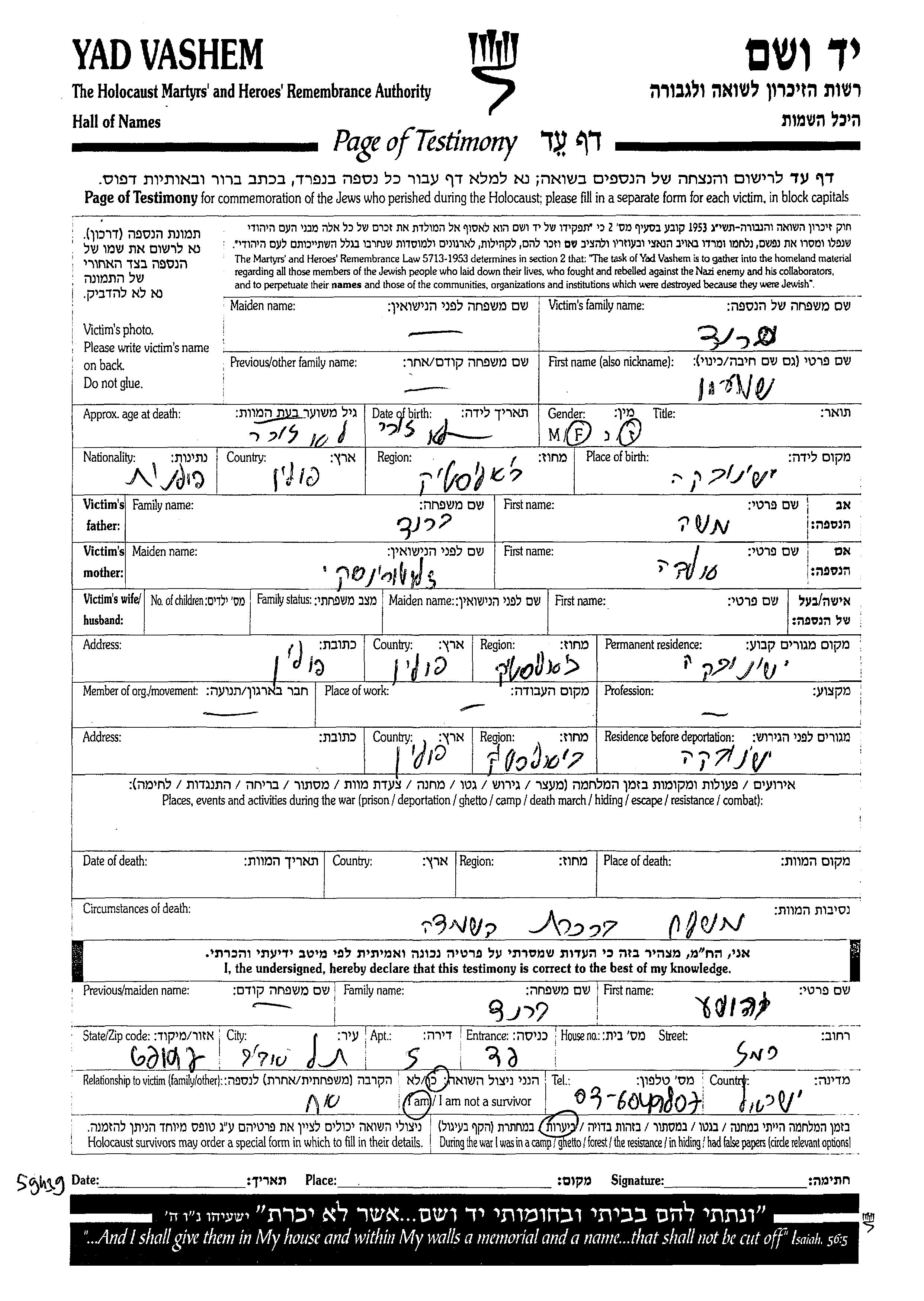 Yad Vashem - Pages of Testimony Names Memorial Collection
