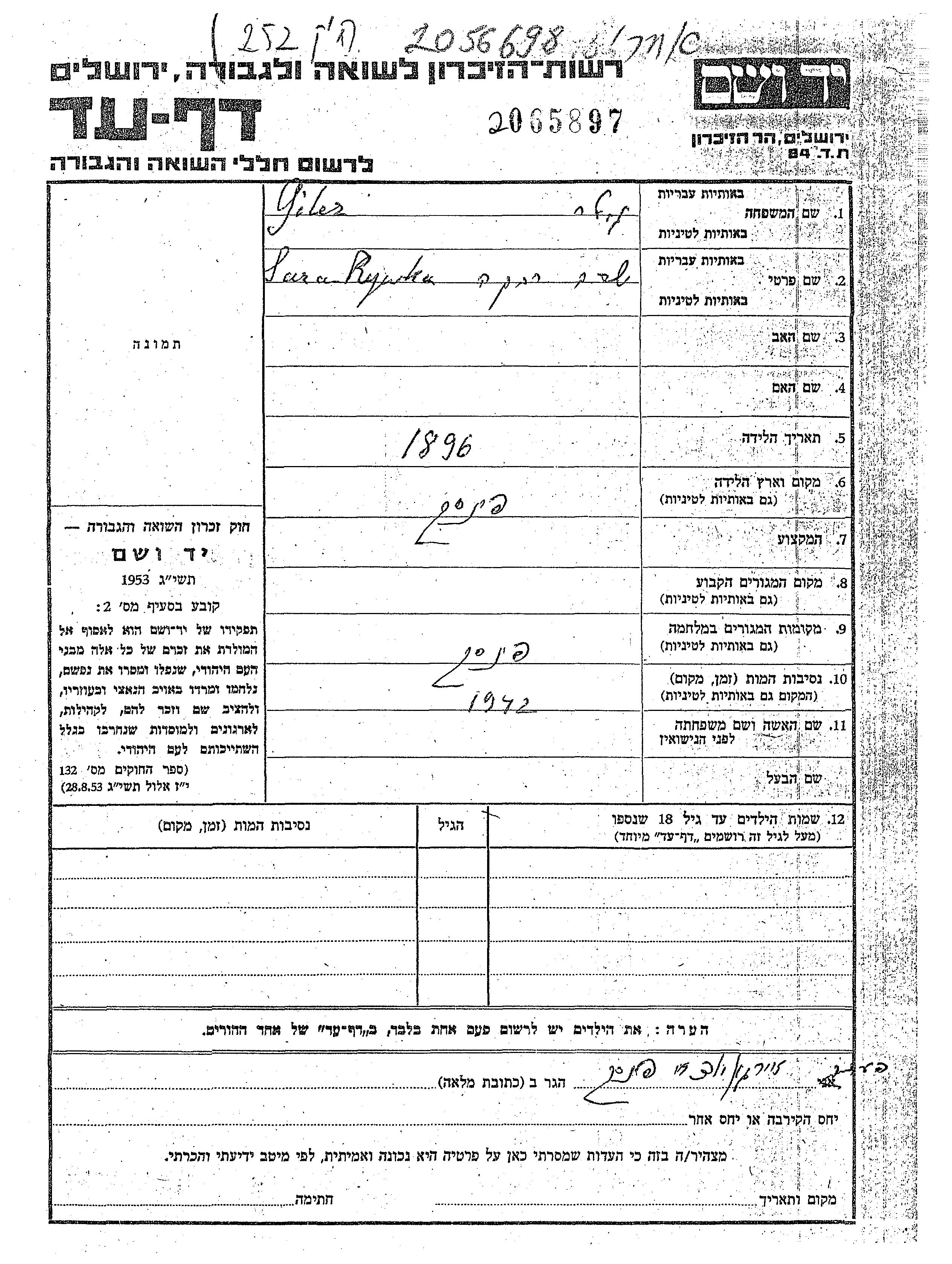 Giler Ryvka Sara 1896 endroit inconnu, Feuille de témoignage