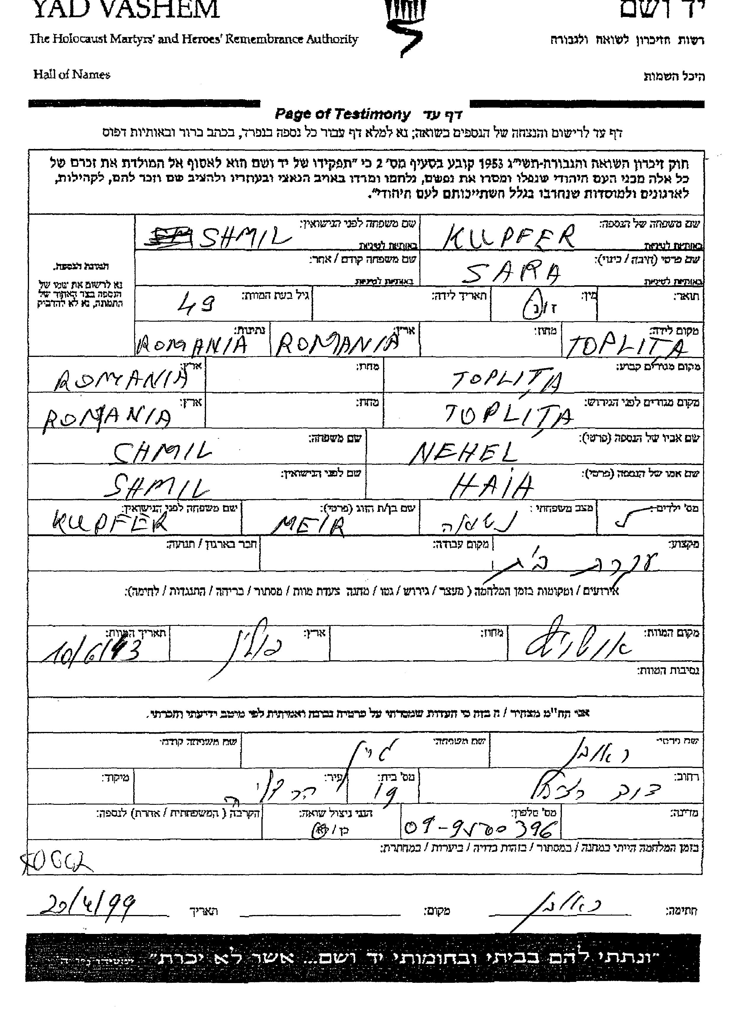 Kupfer Sara Toplita, Roumanie Feuille de témoignage