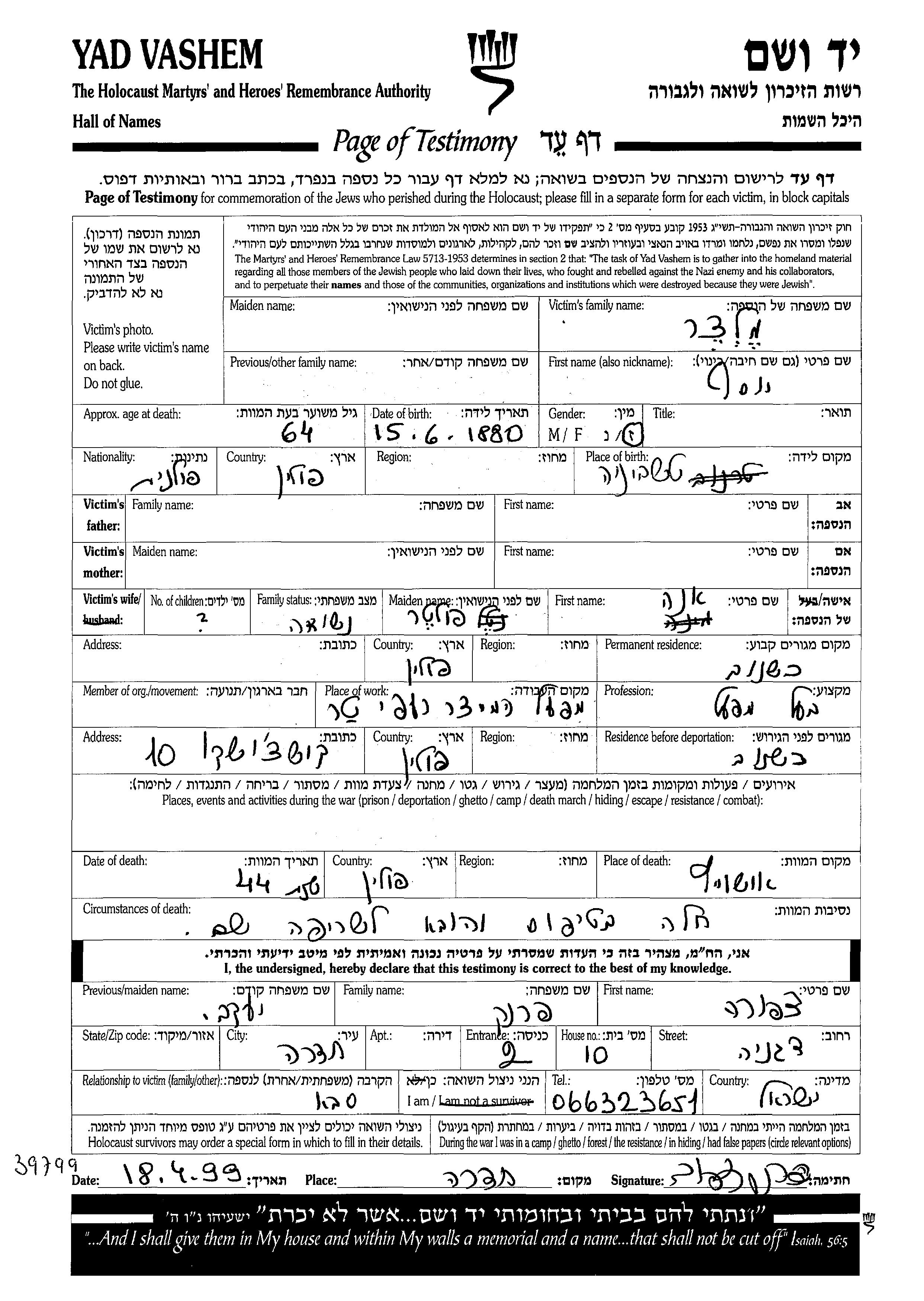 Yad Vashem - Pages of Testimony Names Memorial Collection