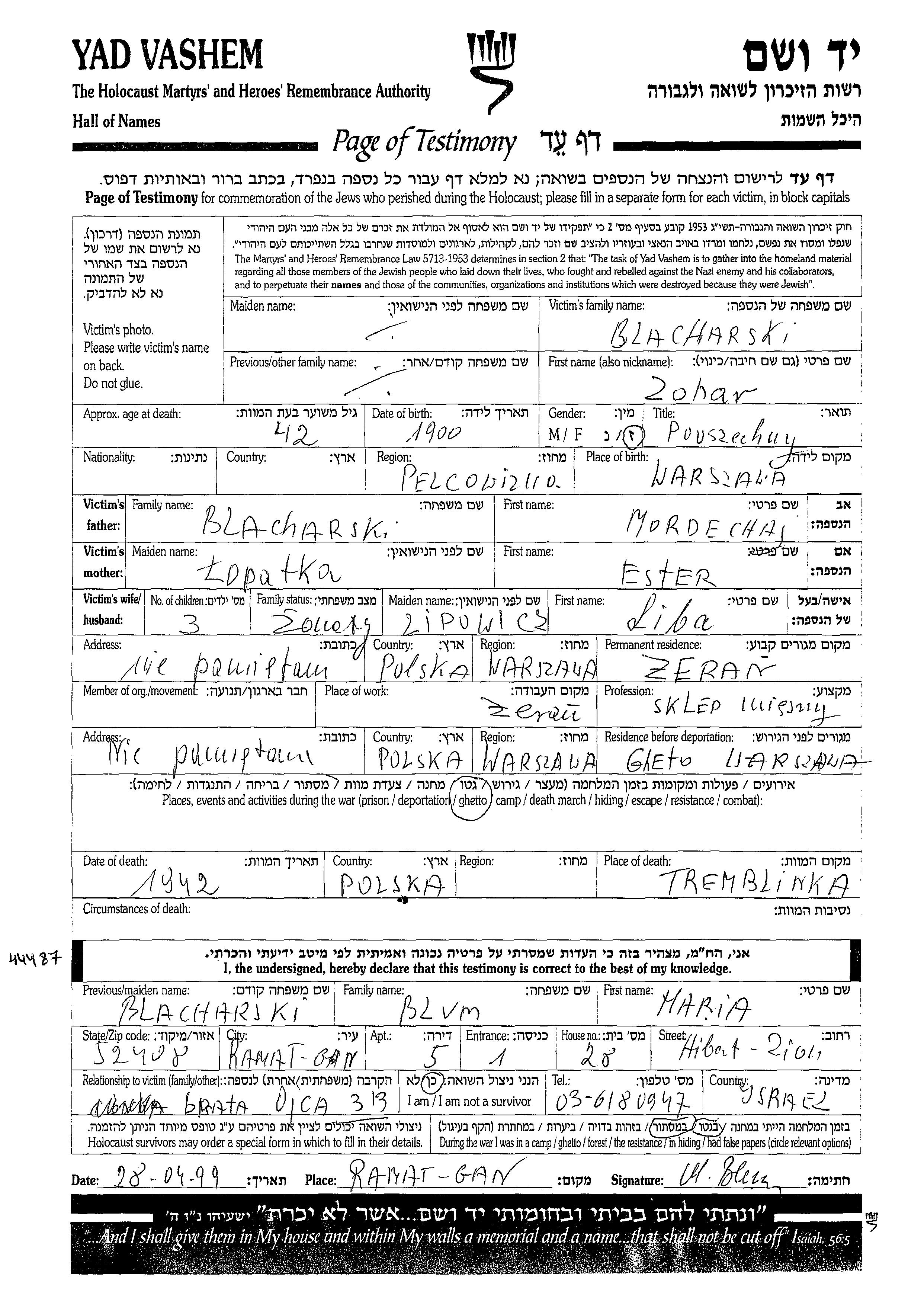 Zohar Blacharski est né à Pelcowizna, Pologne en 1900, fils de Mordechaj et de Ester née Lopatka. Il était Propriétaire d'un magasin et Mariée à Liba née Lipowicz. Avant la seconde guerre mondiale il vivait à Zeran, Pologne. Au cours de la guerre, il était à Warszawa, Pologne.
