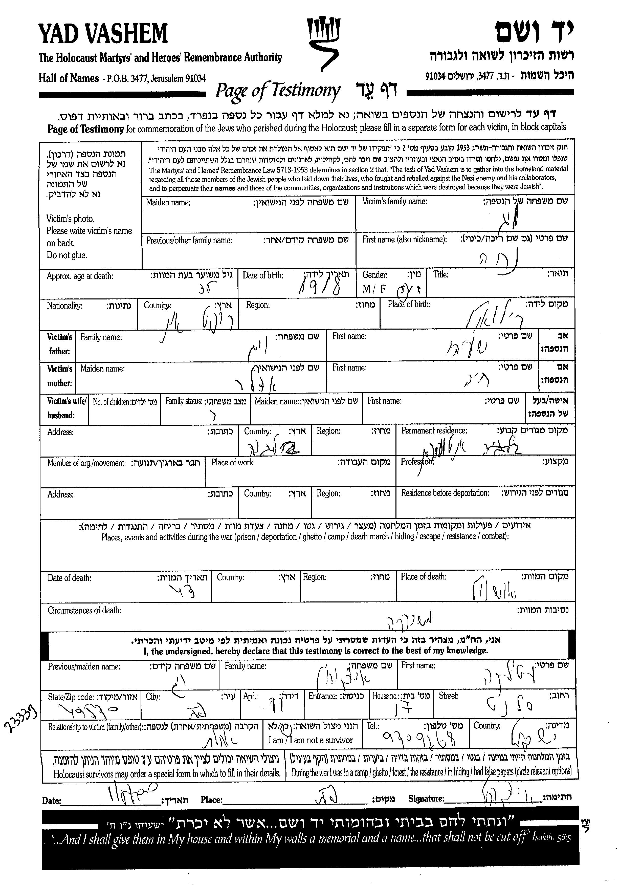 Yad Vashem - Pages of Testimony Names Memorial Collection