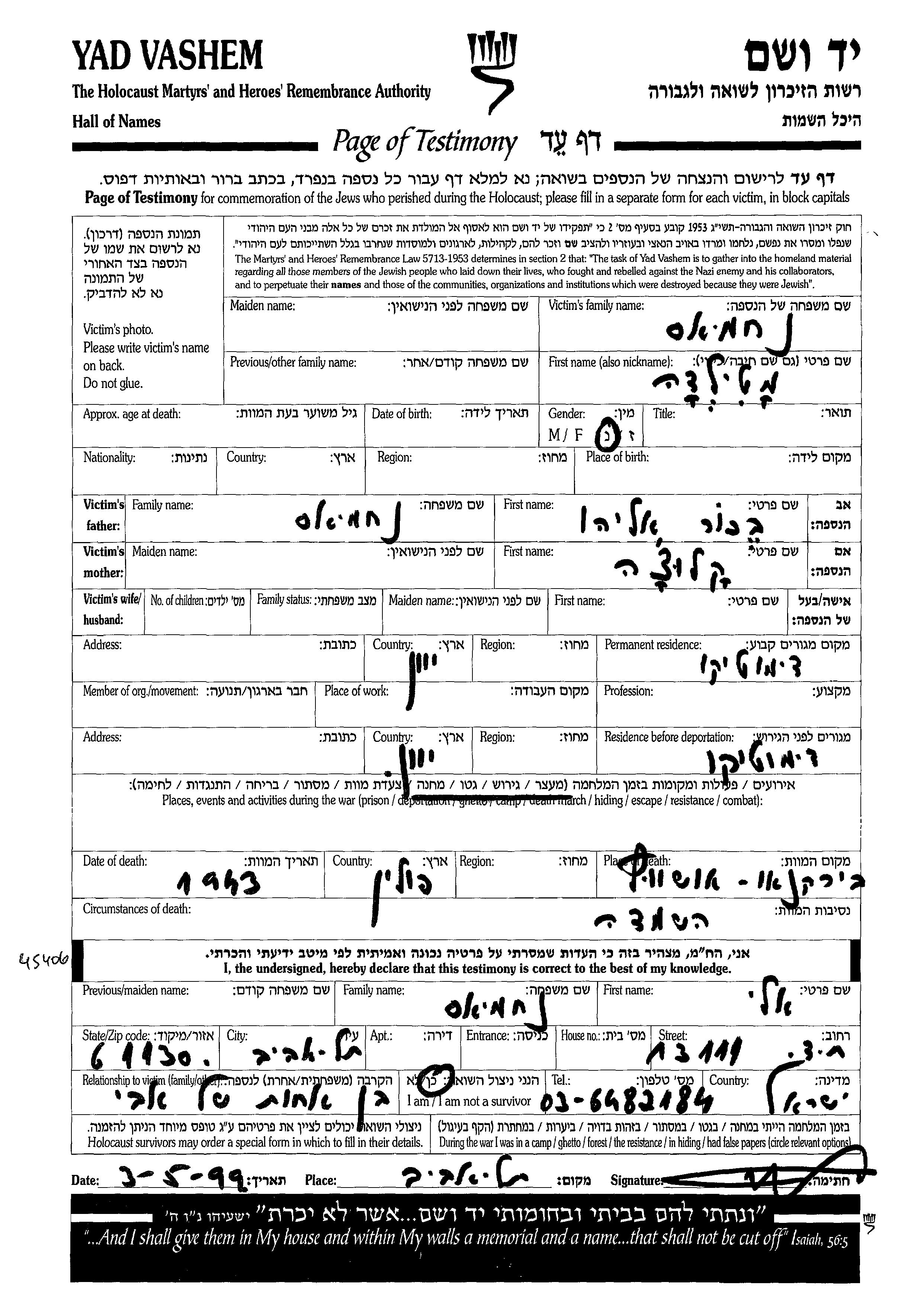 Yad Vashem - Pages of Testimony Names Memorial Collection