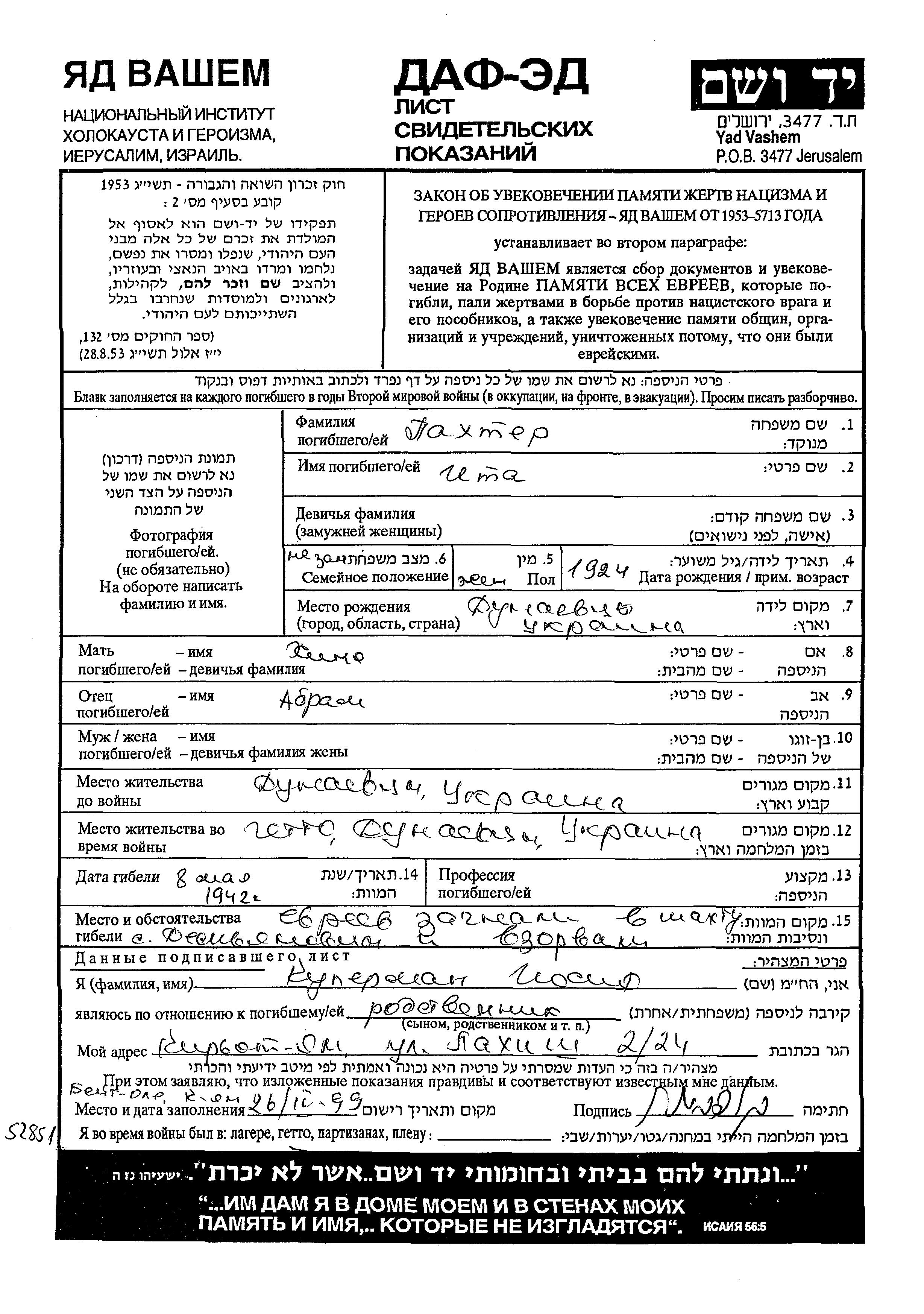 Pakhter Ita 1924 Dunayevtsy, Ukraine (URSS) Feuille de témoignage