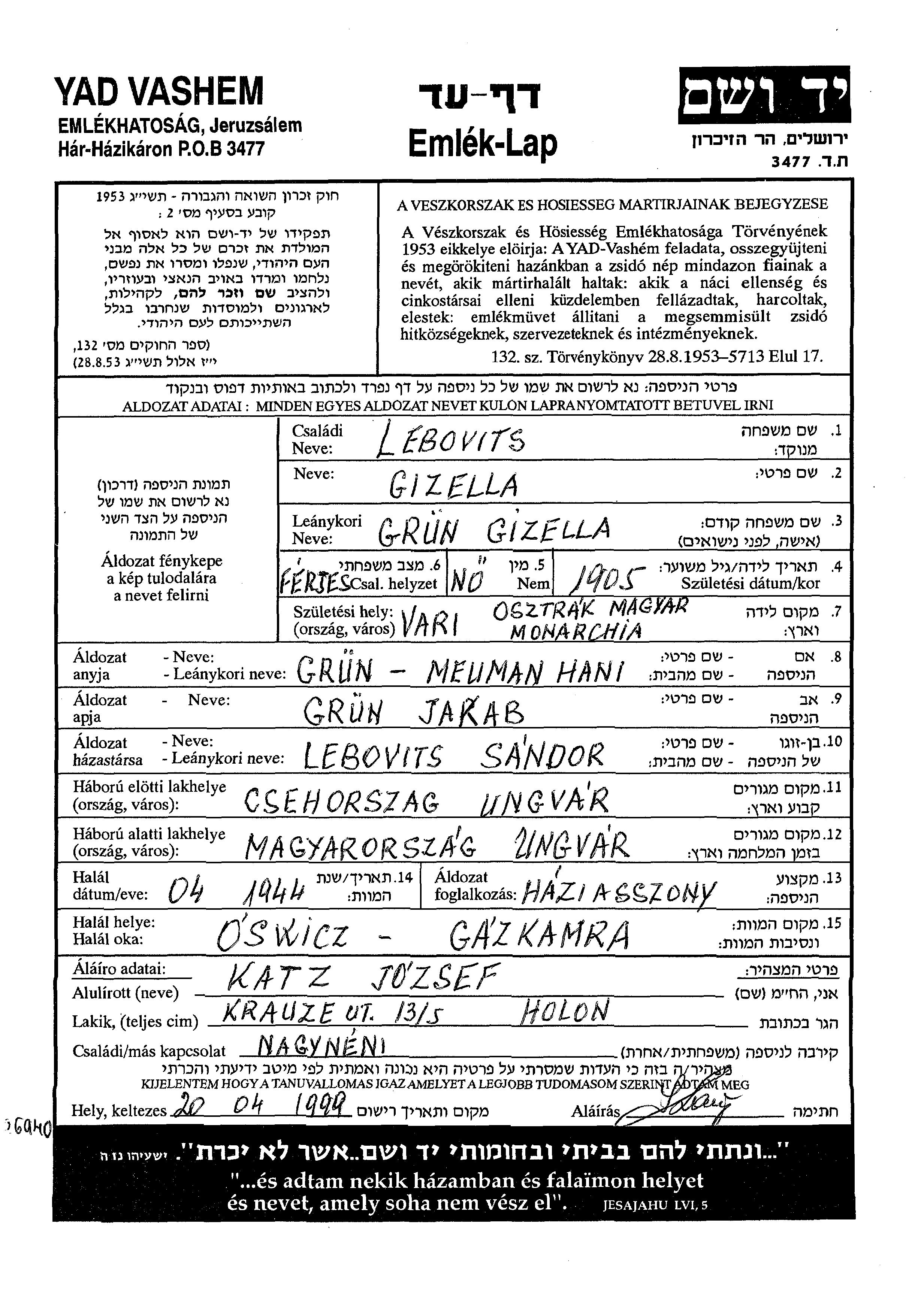 Lebovits Gizella 1905 Ungvar, Tchécoslovaquie Feuille de témoignage