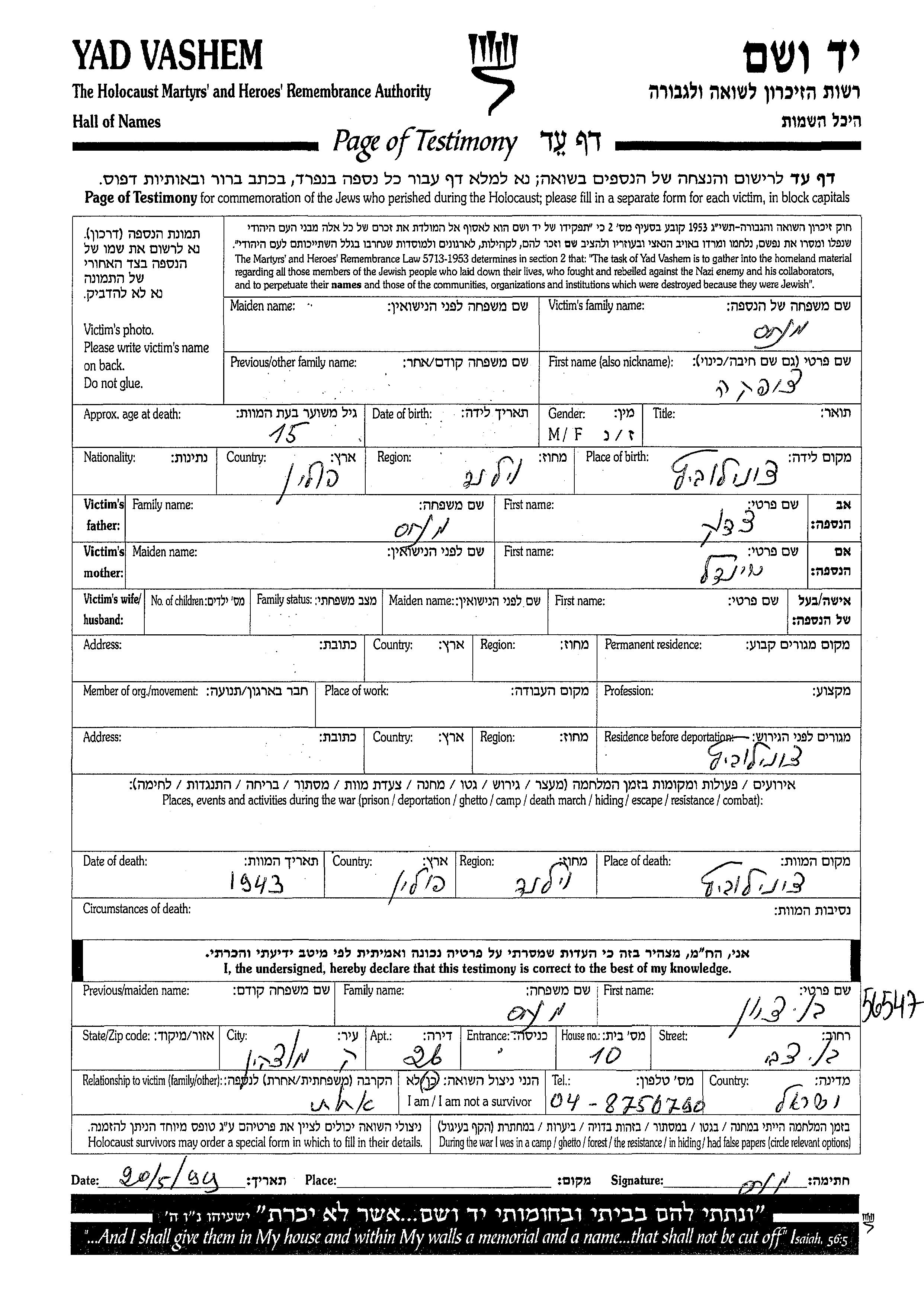 Yad Vashem - Pages of Testimony Names Memorial Collection