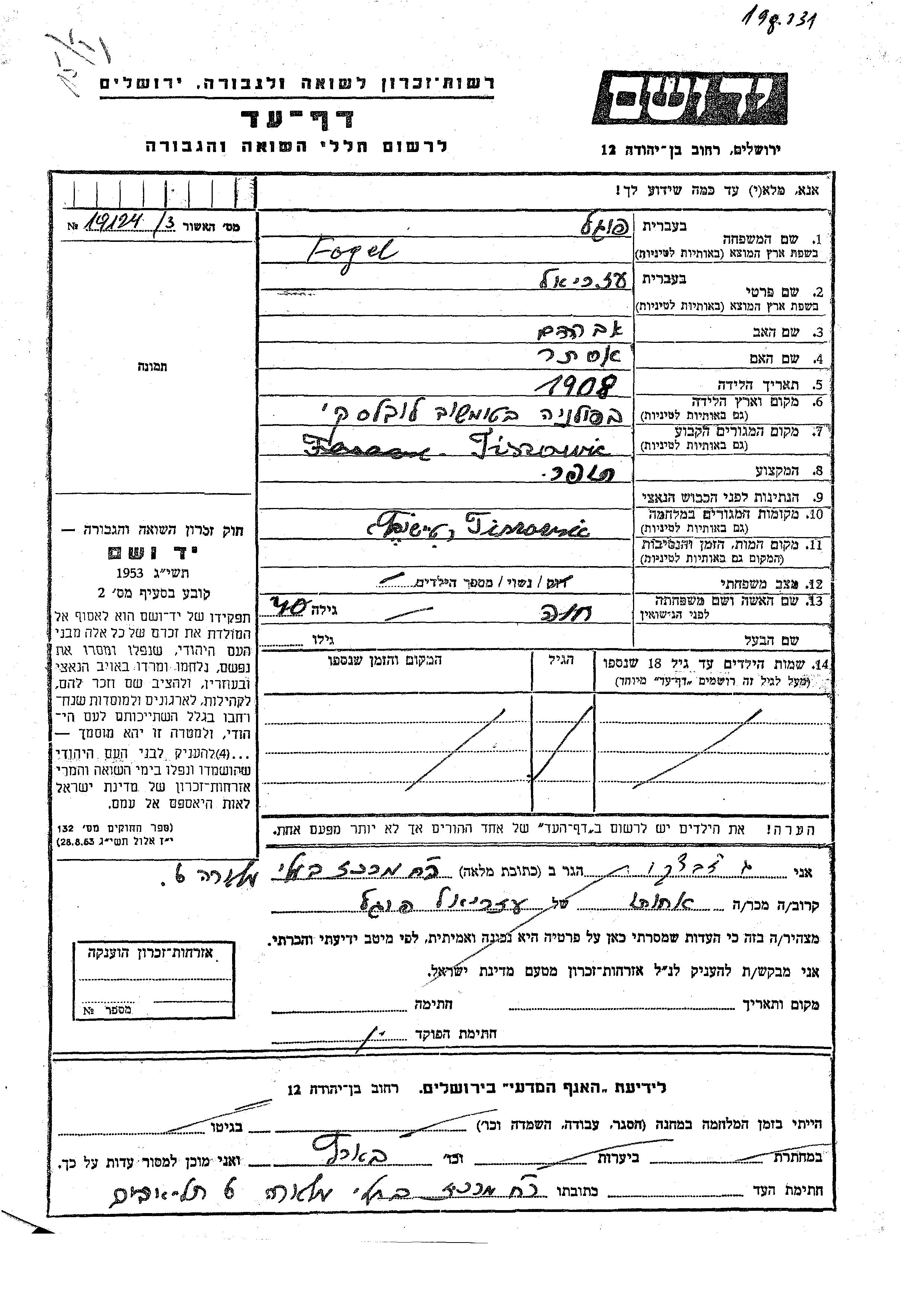 Fogel Azriel 1908 Tiszowice, Pologne Feuille de témoignage