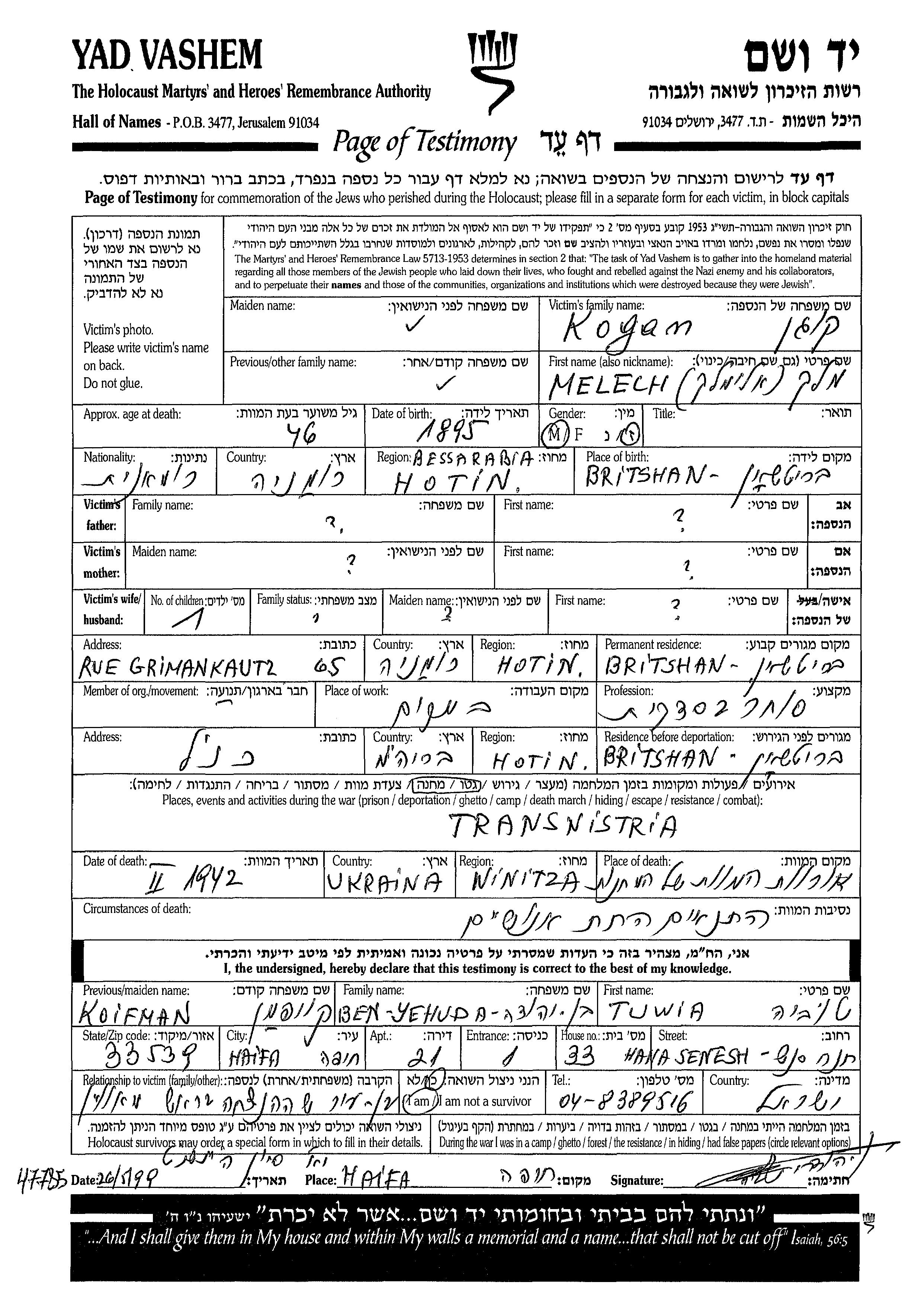 Kogan Elimelekh Melekh 1895 Britshani, Roumanie Feuille de témoignage