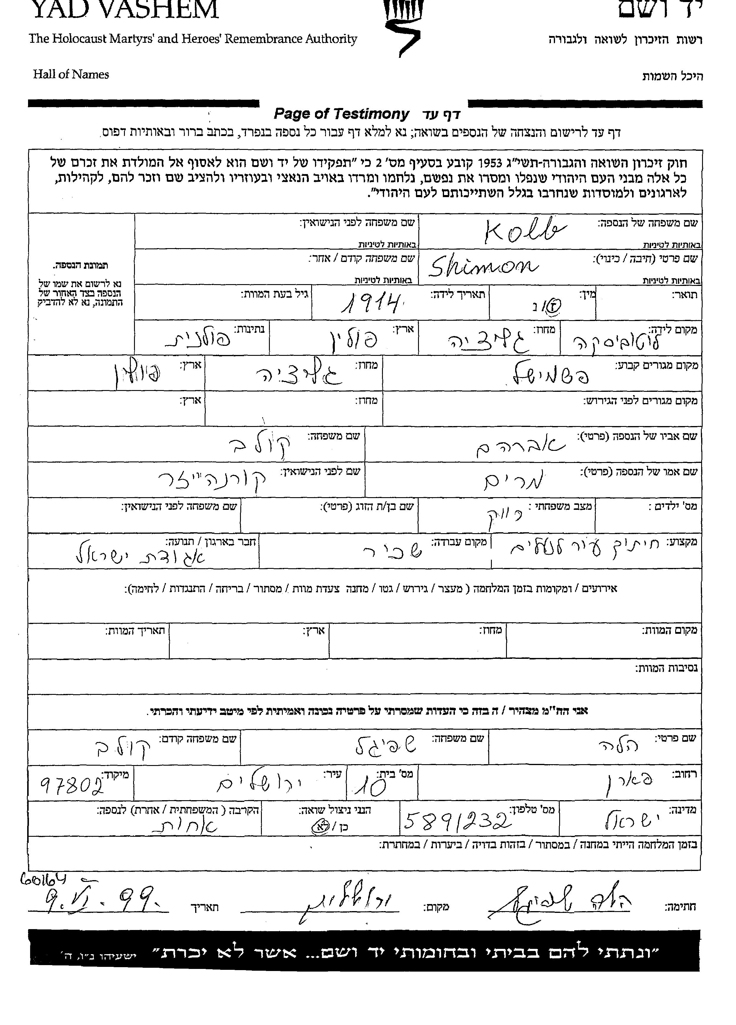 Shimon Kolb est né à Lutowiska, Pologne en 1914, fils de Avraham et de Miriam née Kornheizer. Il était חיתוך עורות et Célibataire. Avant la seconde guerre mondiale il vivait à Przemysl, Pologne.