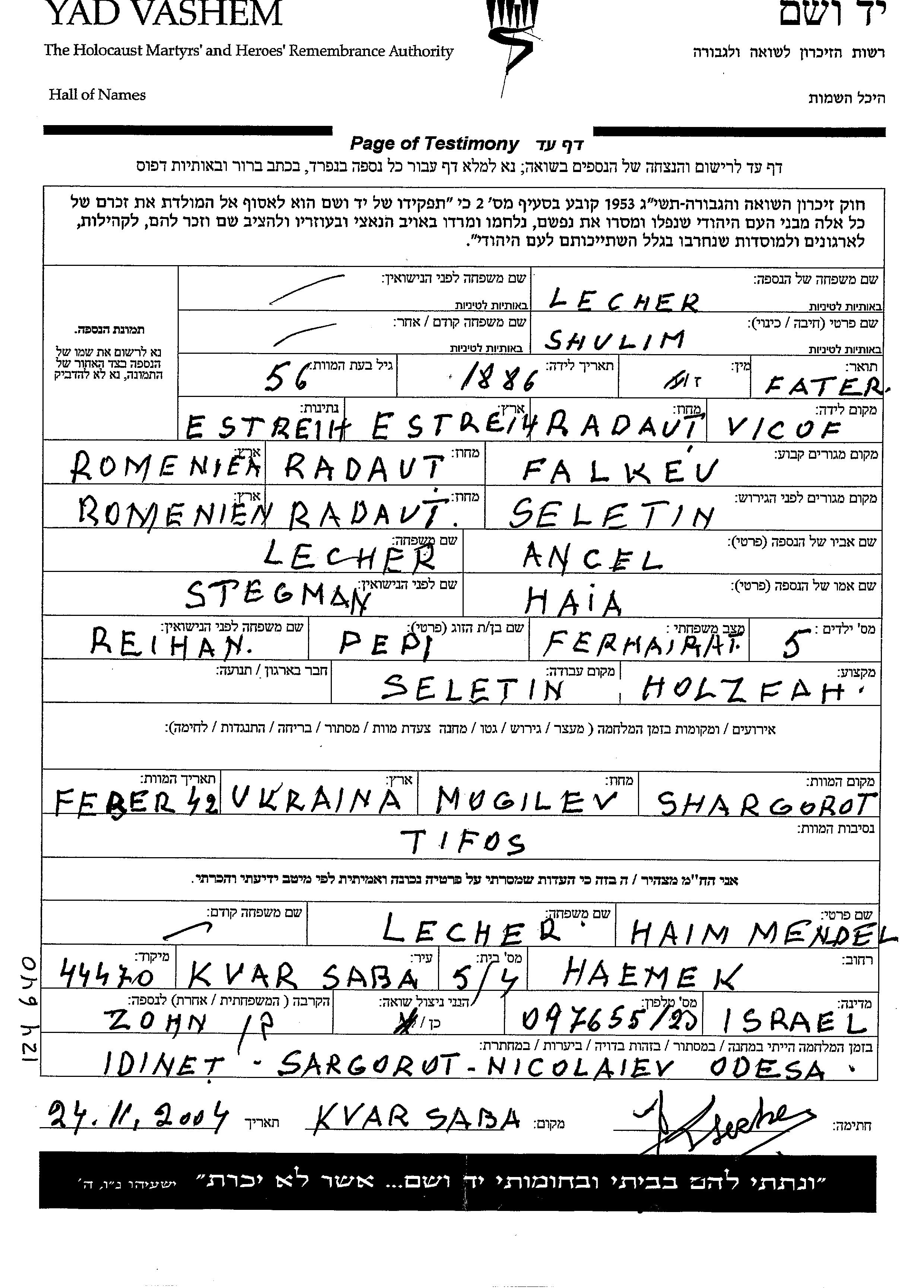 Shulim Lecher est né à Vicov, Roumanie en 1886, fils de Ancel et de Haia née Stegman. Il était Négociant en bois et Mariée à Pepi née Reihan. Avant la seconde guerre mondiale il vivait à Falcau, Roumanie. Au cours de la guerre, il était à Seletin, Roumanie.