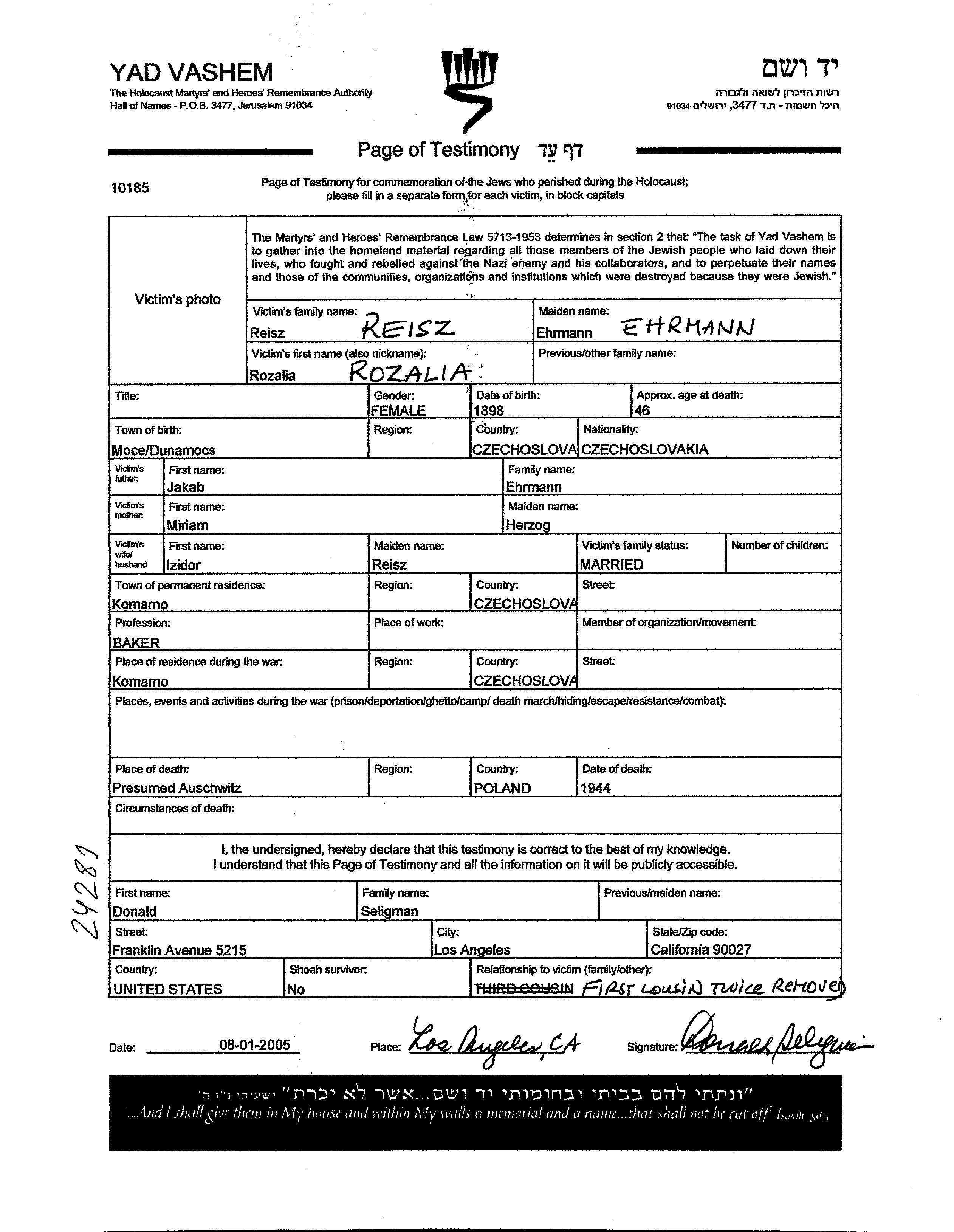 Reisz Rozalia 1898 Komarno, Tchécoslovaquie Feuille de témoignage (digitale-signée)