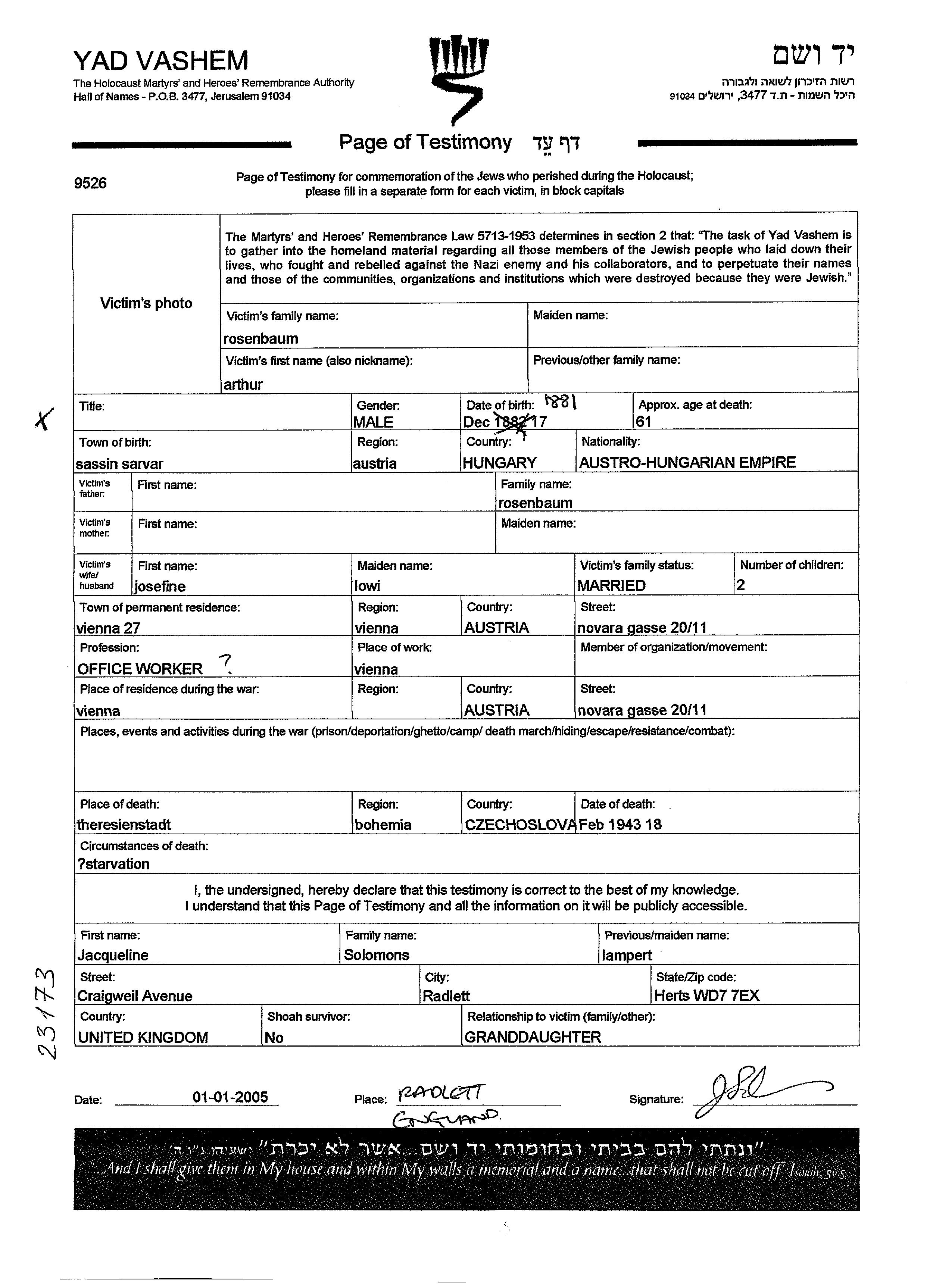 Arthur Rosenbaum est né à Sarvar, Hongrie en 1881. Il était Mariée à Josefine née Lowi. Avant la seconde guerre mondiale il vivait à Vienna, Autriche. Au cours de la guerre, il était à Vienna, Autriche. Arthur a été assassiné pendant la Shoah. Lieu de la mort: Theresienstadt, Tchécoslovaquie en 18/02/1943.