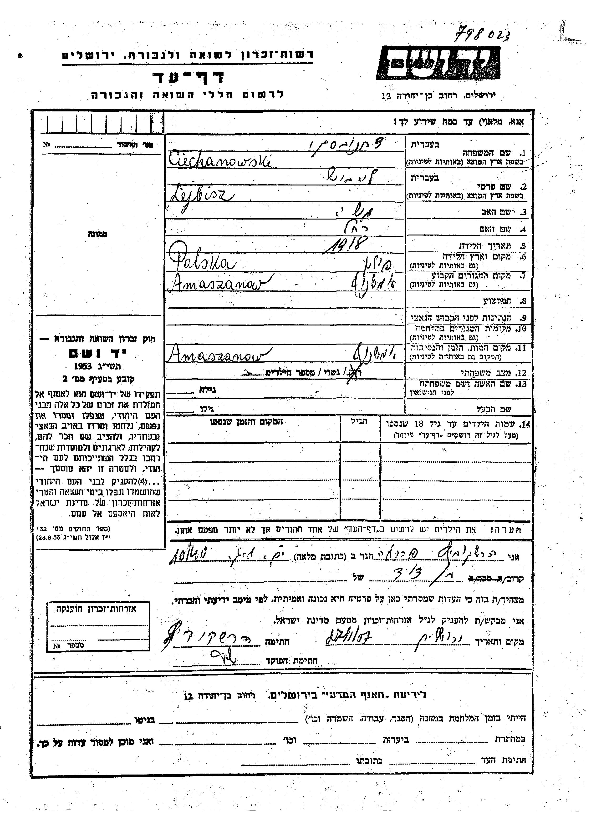Ciechanowski Lejbisz 1918 Amszczynow, Pologne Feuille de témoignage