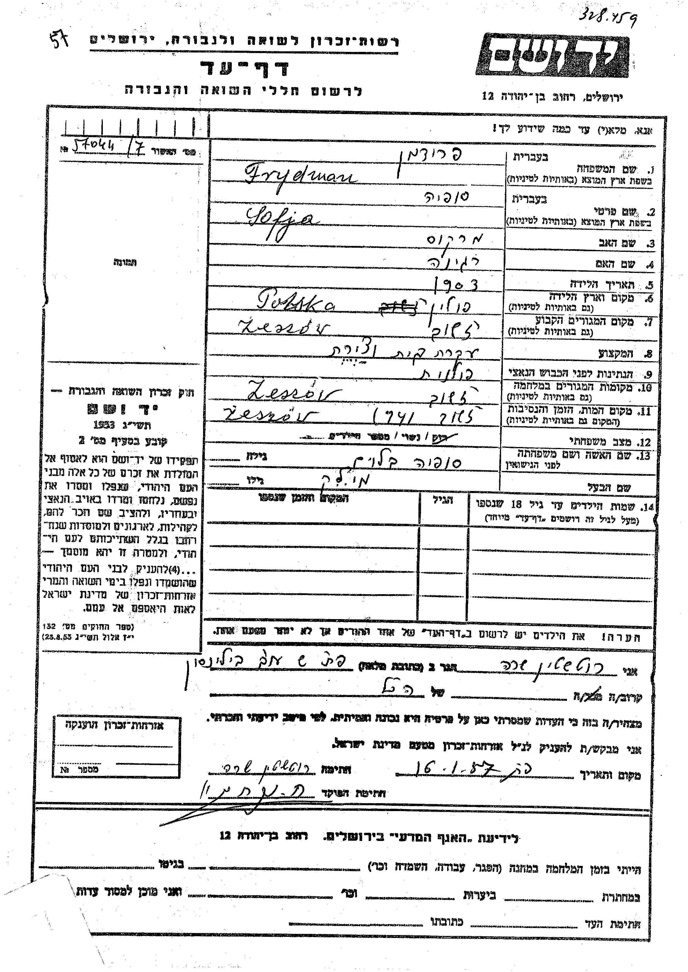 Frydman Sofja 1903 Zeszow, Pologne Feuille de témoignage