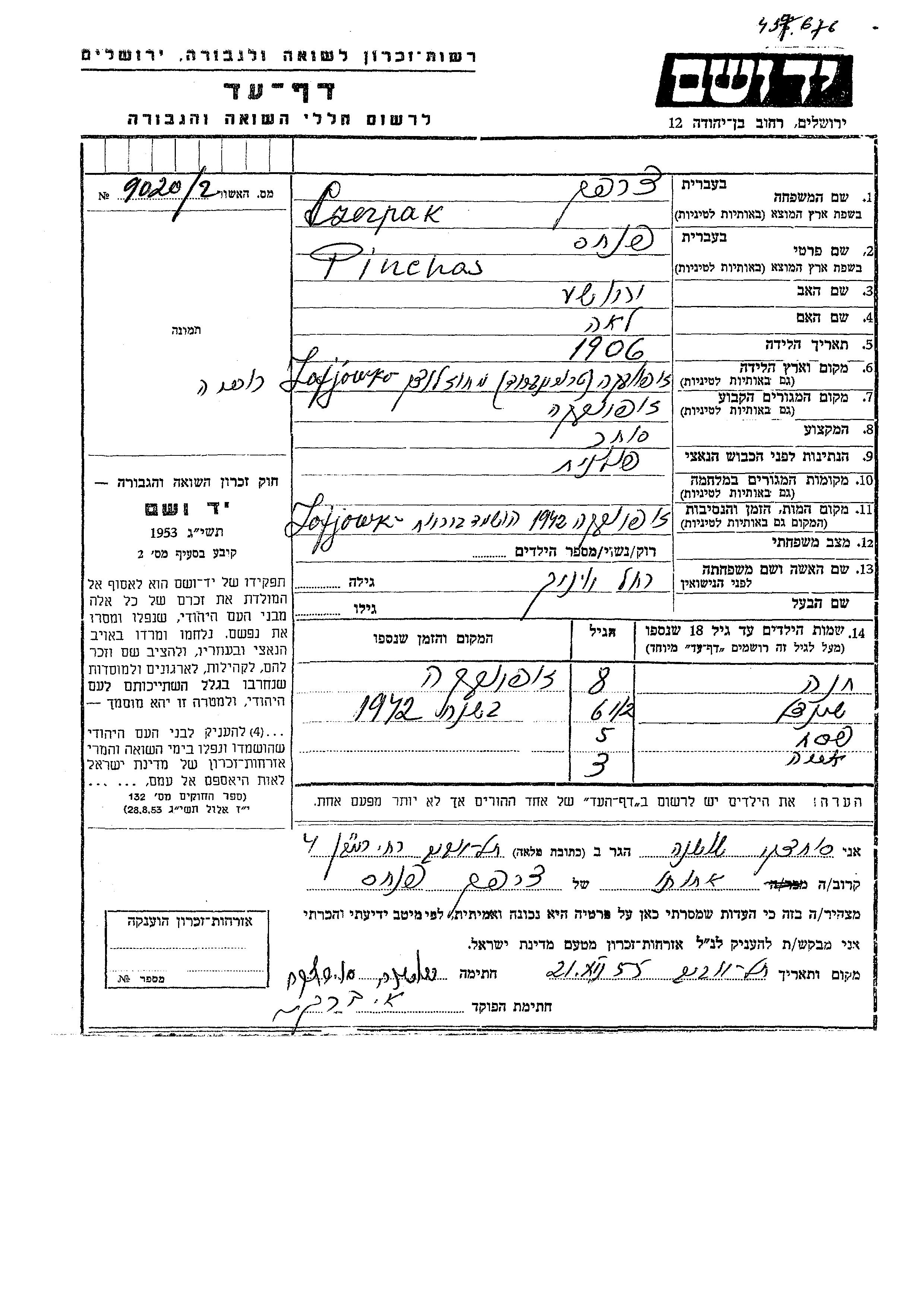 Czerpak Pinchas 1906 Zofjówka, Pologne Feuille de témoignage