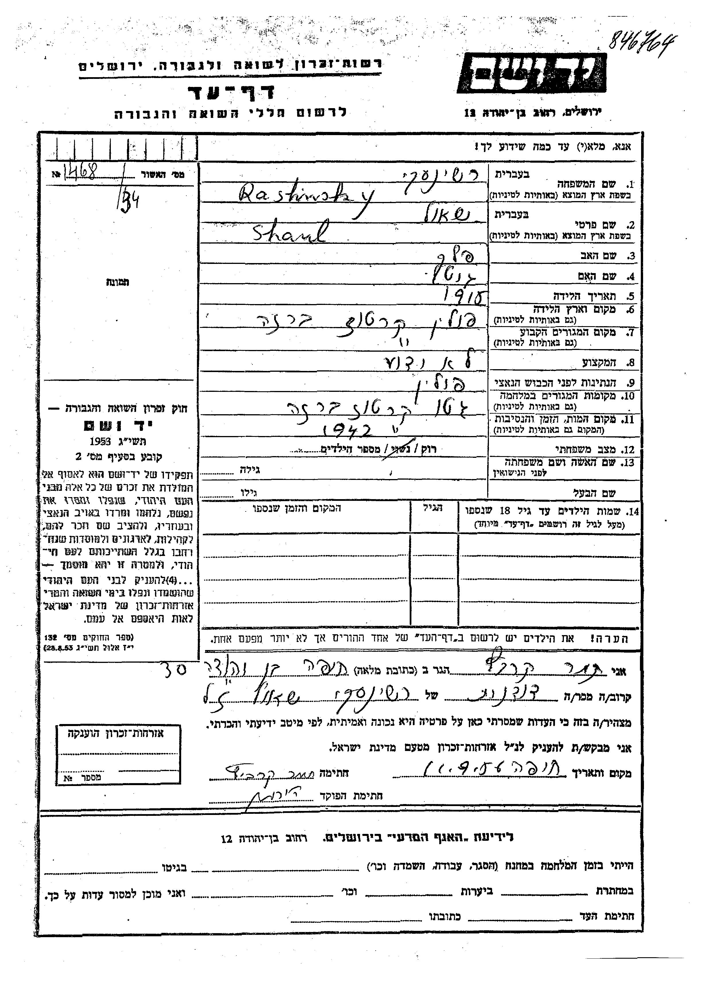 Rashinsky Shaul 1915 Bereza Kartuska, Pologne Feuille de témoignage