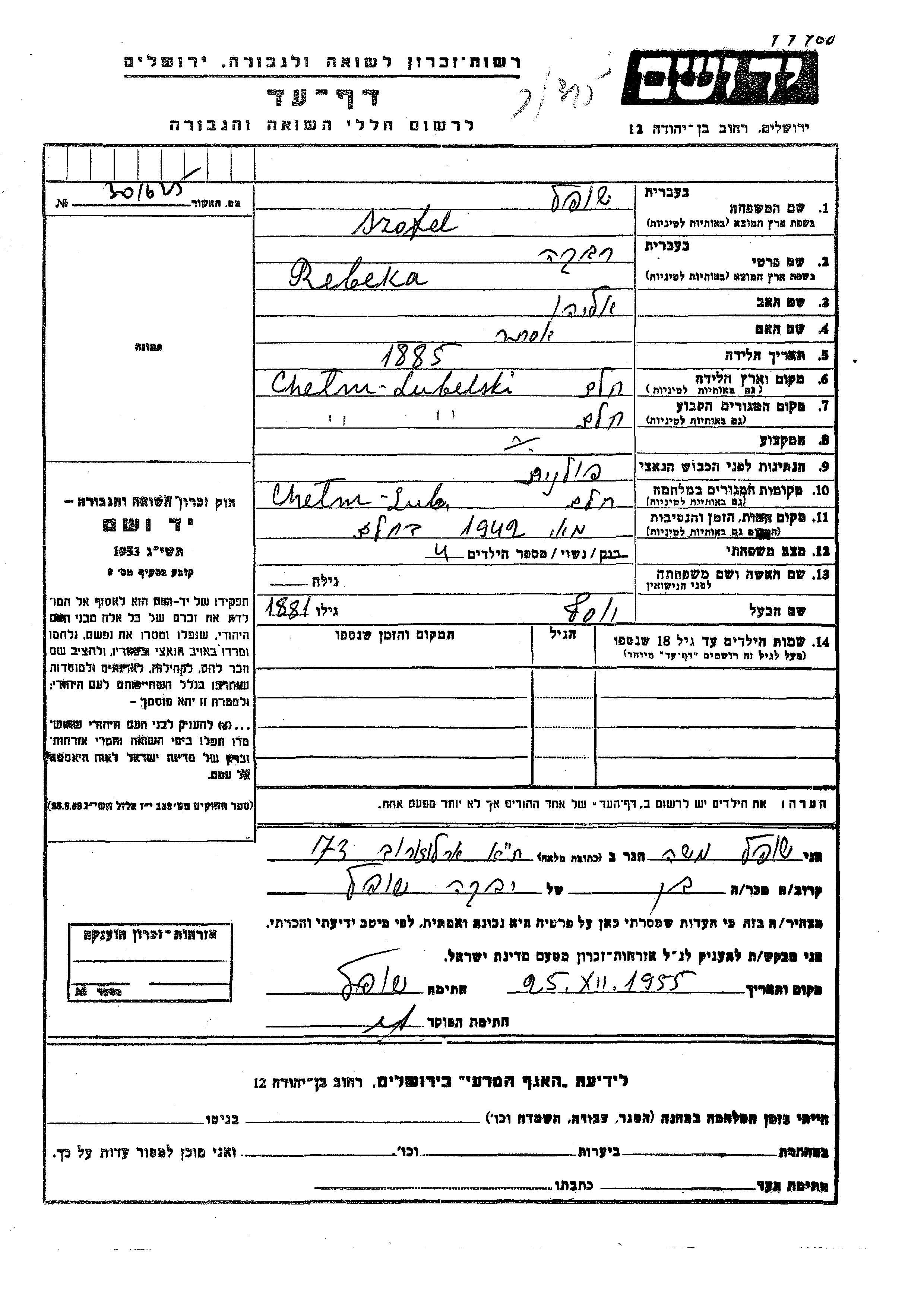 Szofel Rebeka 1885 Chelm, Pologne Feuille de témoignage