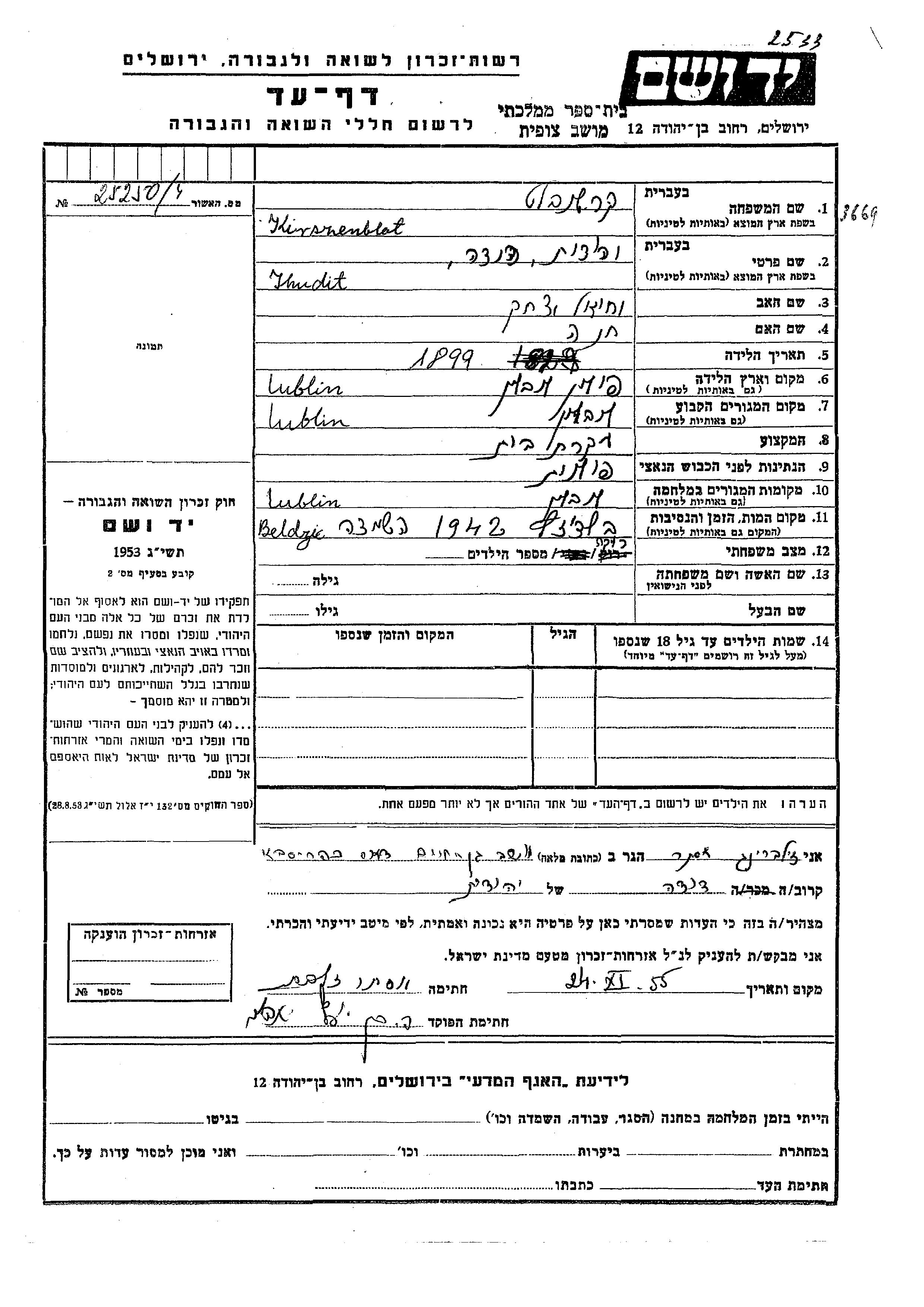 Kirszenblat Kershenblat Jhudit Hinda 1899 Lublin, Pologne Feuille de témoignage