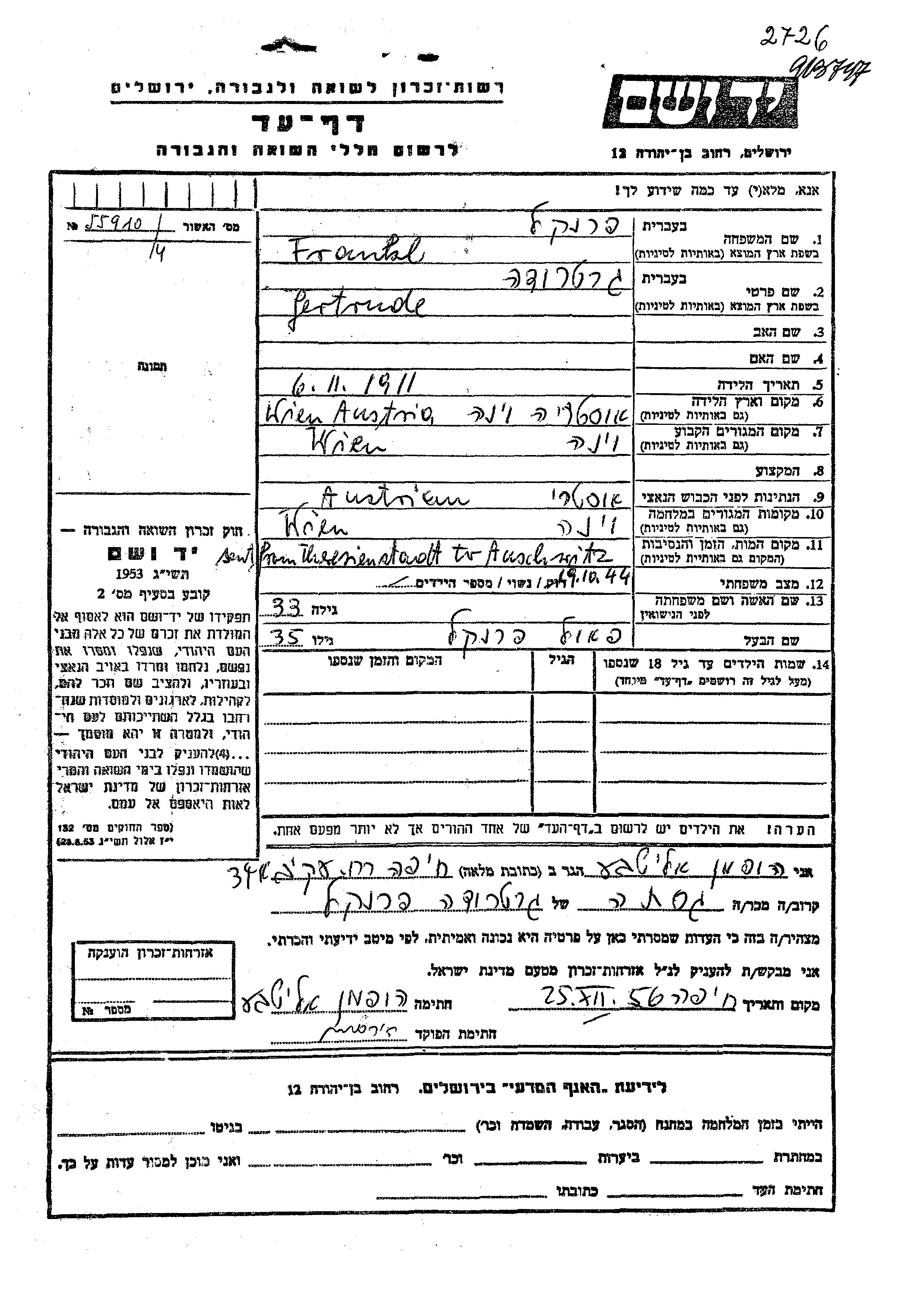Frankl Gertrude 1911 Wien, Autriche Feuille de témoignage