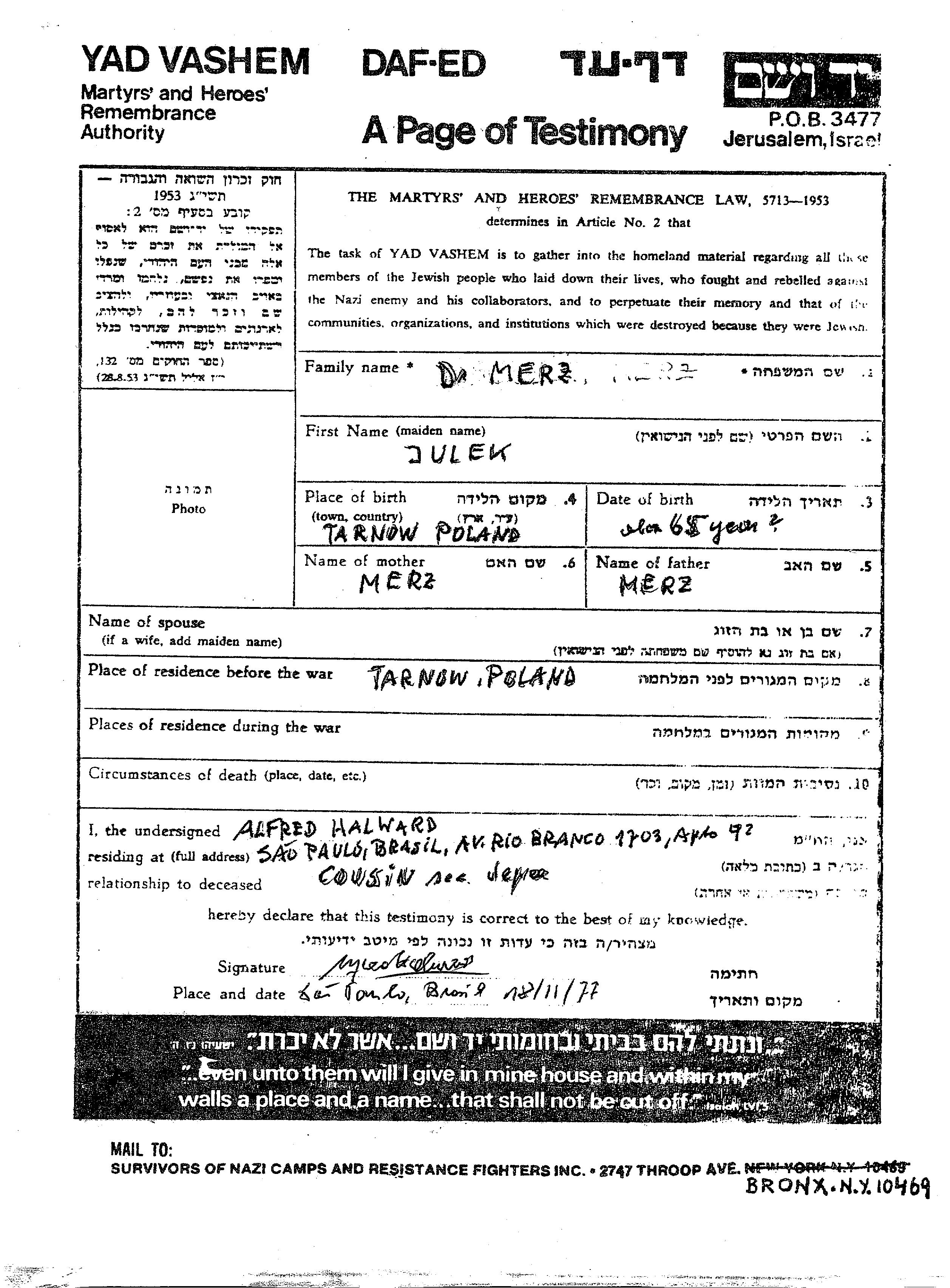 Merz Julek Tarnow, Pologne Feuille de témoignage