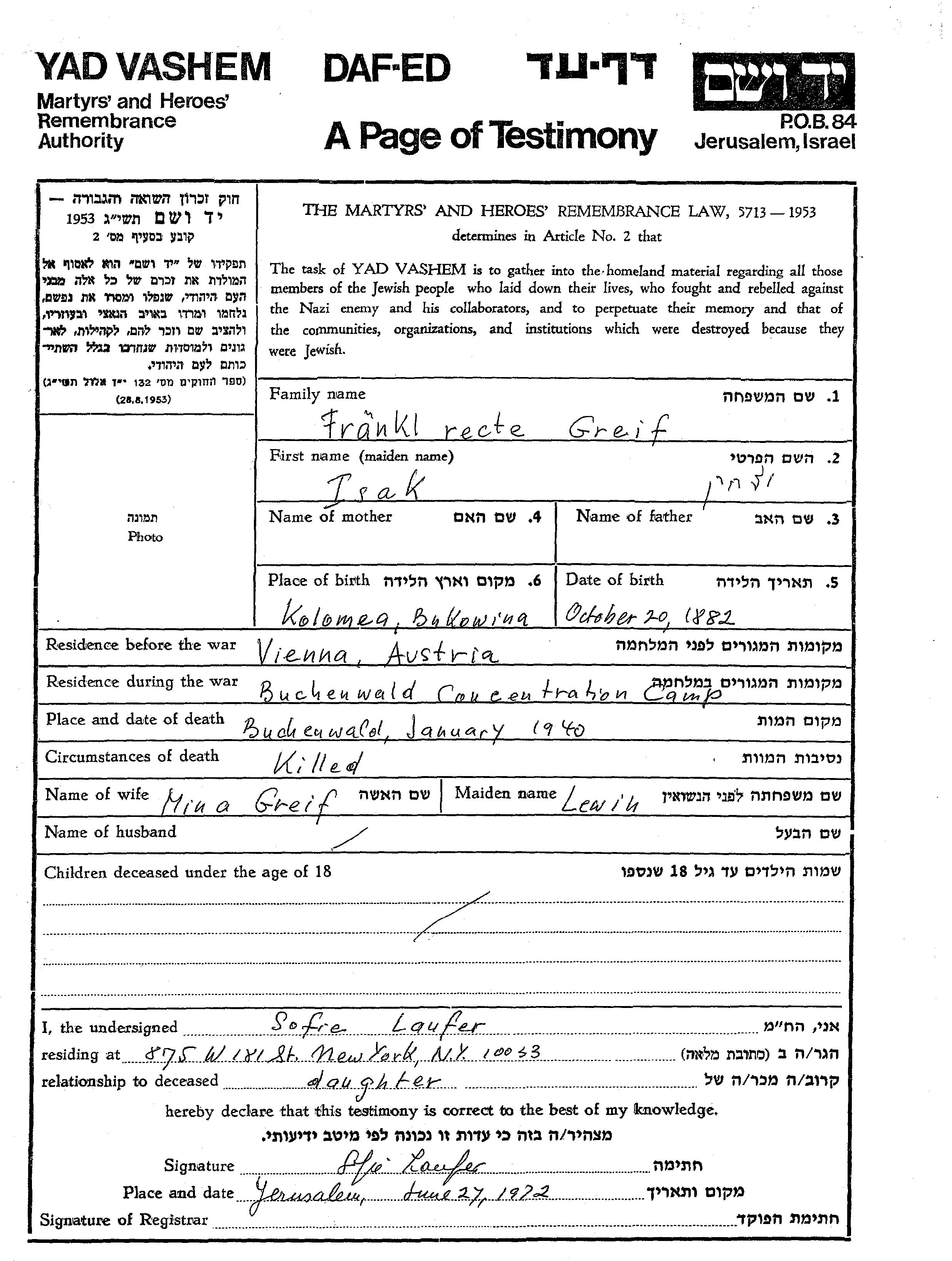 Isak Franki Greif est né à Kolomea, Pologne en 1882. Avant la seconde guerre mondiale il vivait à Vienna, Autriche. Au cours de la guerre, il était à Buchenwald, Allemagne.