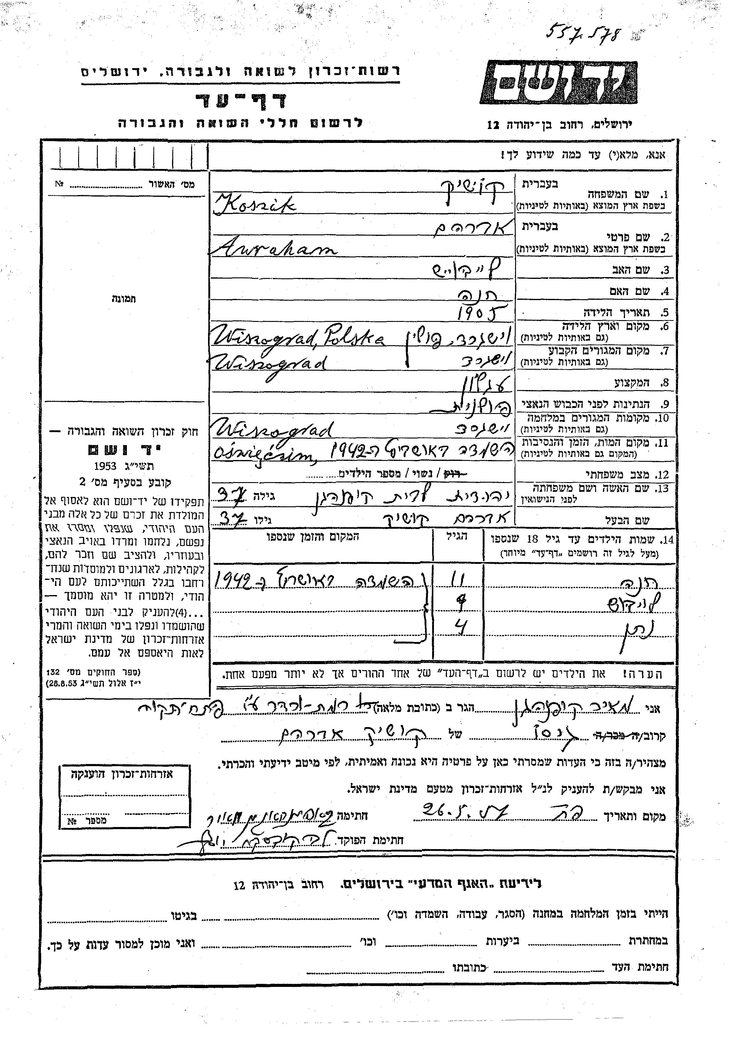 Koszik Awraham 1905 Wiszograd, Pologne Feuille de témoignage