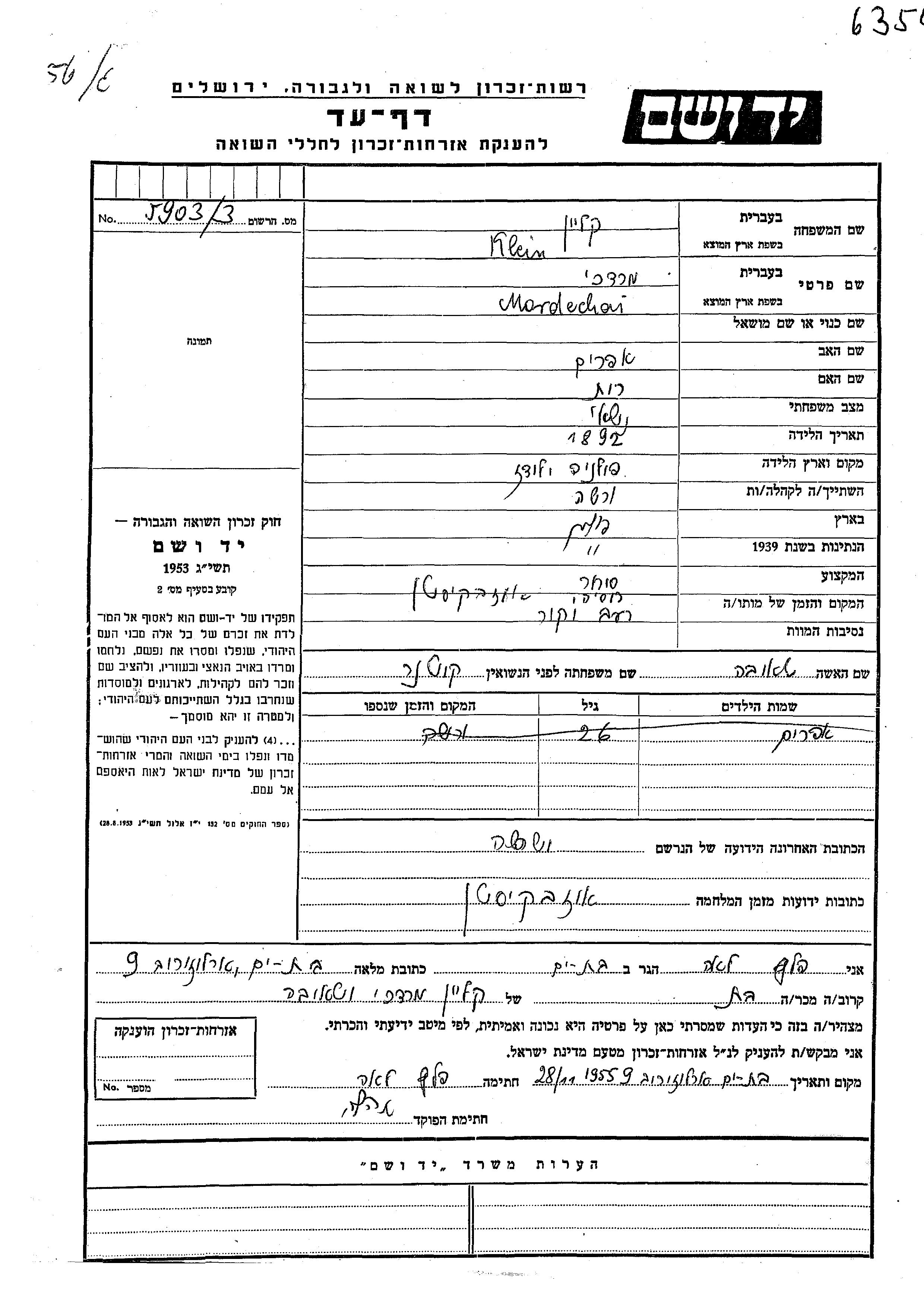 Mordechai Klein est né à Lodz, Pologne en 1892, fils de Efraim et de Rut. Il était Commerçant/e et Mariée à Tauba née Kutner. Avant la seconde guerre mondiale il vivait à Warsaw, Pologne. Au cours de la guerre, il était à Ouzbékistan (URSS).
