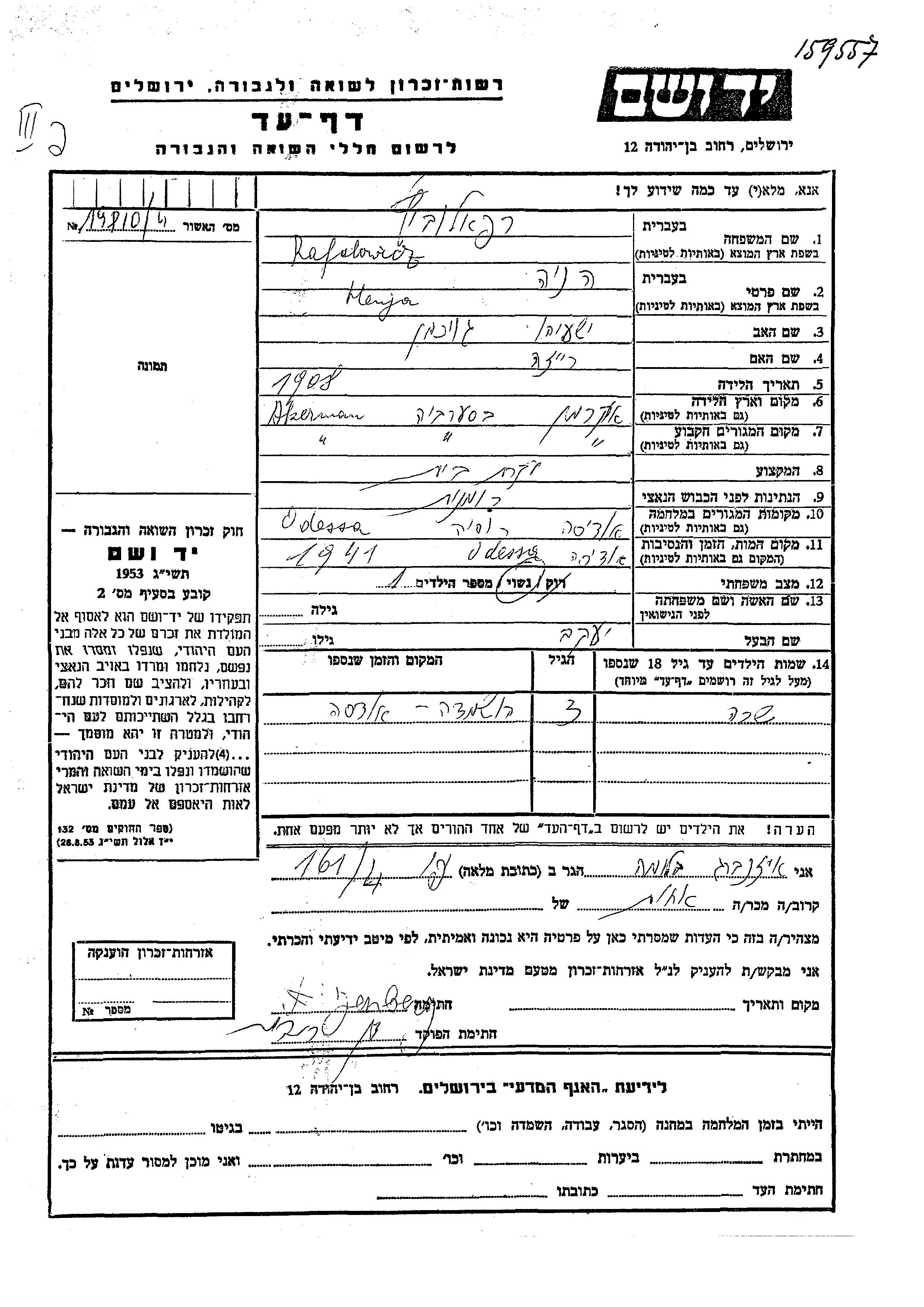 Rafalowicz Henja 1908 Akerman, Roumanie Feuille de témoignage