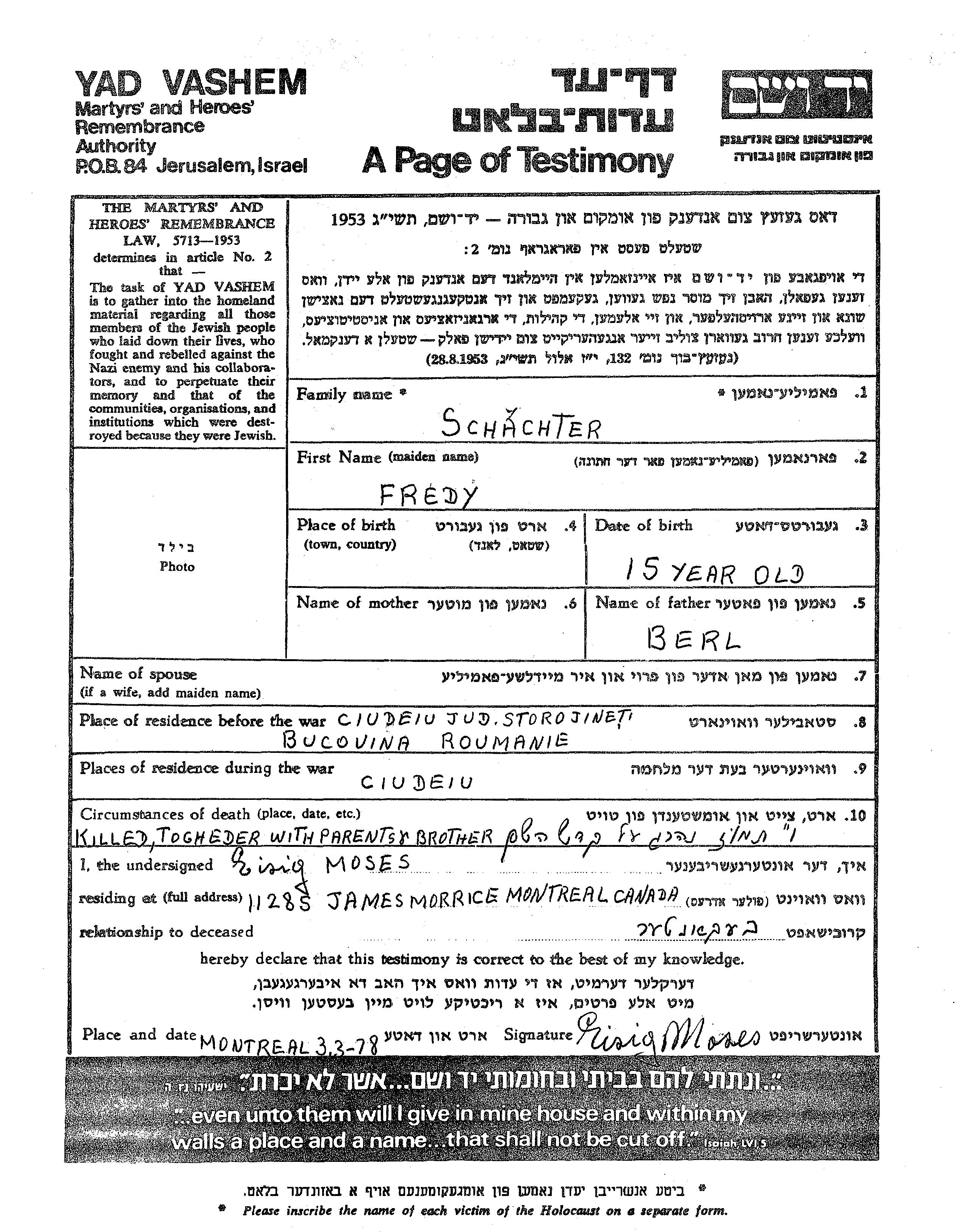 Schachter Fredy Ciudeiu, Roumanie Feuille de témoignage